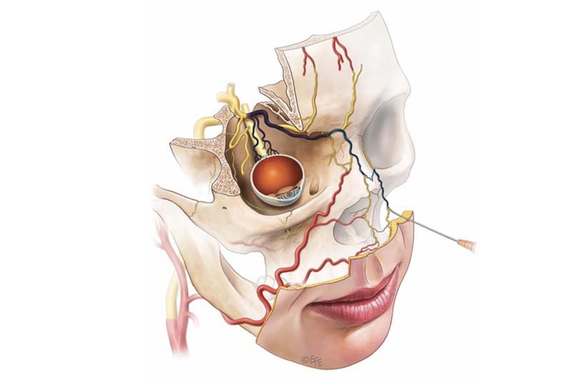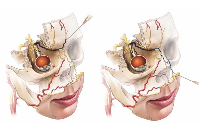 อันตรายที่ 1 การอุดตันเส้นเลือด ไม่ว่าจะเป็นการฉีดฟิลเลอร์ (Filler) หรือฉีดไขมันหน้า สามารถอุดตันเส้นเลือดได้ โดยเฉพาะที่หน้าผาก จะมีเส้นเลือด 2 คู่ บริเวณหัวคิ้วและกลางคิ้วซึ่งวิ่งเข้าลูกตาได้ อาจจะทำให้มีปัญหาเรื่องการมองเห็น หรืออาจจะถึงขั้นตาบอดได้ดังนั้นควรจะปรึกษาคุณหมอผู้มีประสบการณ์ มีความชำนาญ รู้หลัก Anatomy เส้นเลือดบนใบหน้าคนไข้อย่างลึกซึ้ง และรู้วิธีการป้องกันและแก้ไขปัญหาอันตรายจากเส้นเลือดได้ทัน จุดที่ 2 คือ บริเวณสันจมูก มีเส้นเลือดที่วิ่งเข้าลูกตาได้ คุณหมอไม่แนะนำให้ฉีดฟิลเลอร์ (Filler) เข้าไปที่สันจมูก เพราะเป็นจุดที่อันตราย และอีกจุดคือบริเวณร่องแก้ม ก็จะมีเส้นเลือดสำคัญที่วิ่งมาจากบริเวณลำคอ และออกมาเป็นแขนงวิ่งผ่านร่องแก้ม แล้วเข้าไปรวมกับเส้นเลือดที่วิ่งเข้าลูกตาได้เช่นเดียวกัน