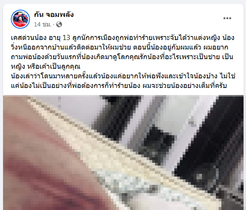 14 ต.ค.65 กัน จอมพลัง ได้โพสต์ภาพร่างกายบอบช้ำ โดยระบุข้อความอ้างว่า ” เคสด่วนน้อง อายุ 13 ลูกนักการเมืองถูกพ่อทำร้ายเพราะจับได้ว่าแต่งหญิง น้องวิ่งหนีออกจากบ้านแล้วติดต่อมาให้ผมช่วย ตอนนี้น้องอยู่กับผมแล้ว ผมอยากถามพ่อน้องด้วยวันแรกที่น้องเกิดมาดูโลกคุณรักน้องที่อะไรเพราะเป็นชาย เป็นหญิง หรือเค้าเป็นลูกคุณ น้องเล่าว่าโดนมาหลายครั้งแล้วน้องแค่อยากให้พ่อฟังและเข้าใจน้องบ้าง ไม่ใช่แค่น้องไม่เป็นอย่างที่พ่อต้องการก็ทำร้ายน้อง ผมจะช่วยน้องอย่างเต็มที่ครับ “