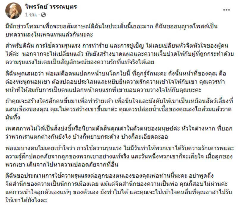 ล่าสุด แพรรี่ ไพรวัลย์ วรรณบุตร ให้ข้อคิดเห็นผ่านเฟซบุ๊กส่วนตัว โดยข้อความตอนหนึ่งระบุว่า การใช้ความรุนแรง การทำร้าย และการขู่เข็ญ ไม่เคยเปลี่ยนหัวจิตหัวใจของผู้คนได้ นอกจากจะไม่เปลี่ยนแล้ว มันยังสร้างบาดแผลและความเจ็บปวดให้กับผู้ที่ถูกกระทำด้วย ความรุนแรงไม่เคยเป็นสัญลักษณ์ของความรักที่แท้จริงได้เลย
