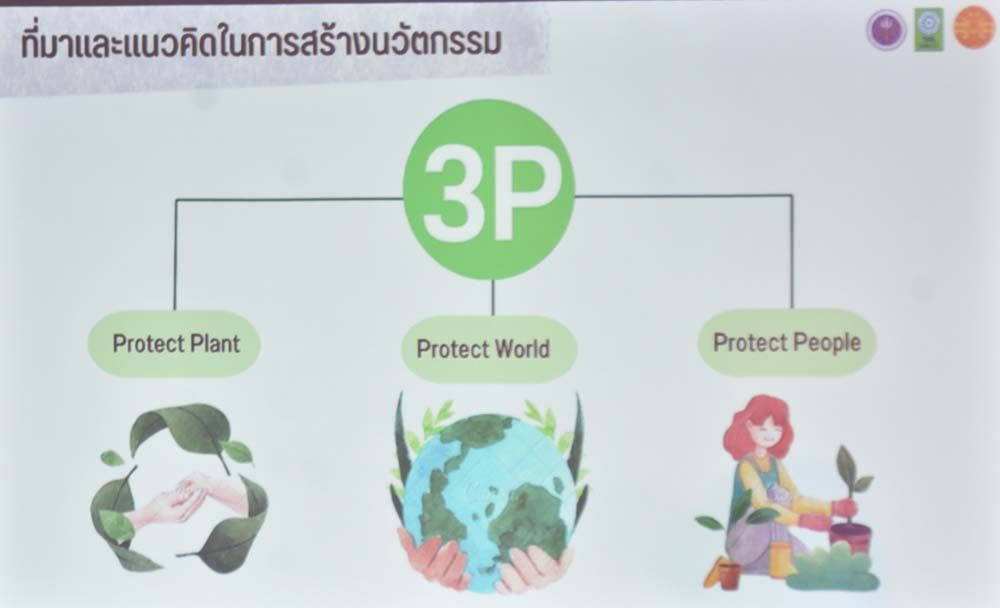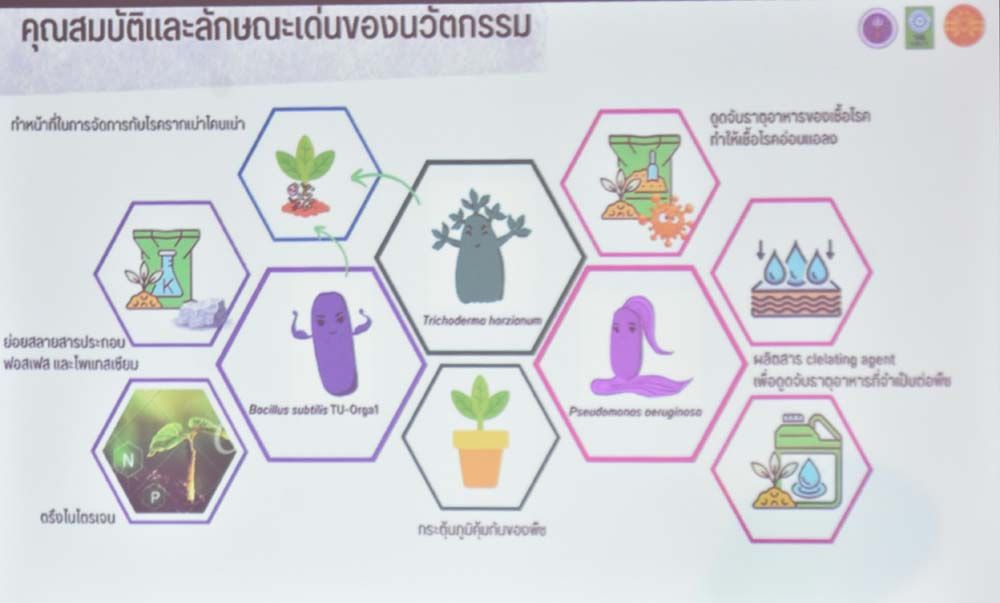 รศ.ดร.ดุสิต อธินุวัฒน์ อาจารย์ที่ปรึกษา เปิดเผยถึงการดำเนินงานของนวัตกรรมฯ ว่า การเผาฟางและตอซังข้าว ก่อให้เกิดมลพิษปล่อยขึ้นสู่บรรยากาศ โดยเฉพาะฝุ่นละอองขนาดเล็ก PM 2.5 ส่งผลกระทบต่อการเปลี่ยนแปลง คุณสมบัติของดินทั้งทางด้านกายภาพ เคมี ชีวภาพ เนื่องจากความร้อนจากการเผาฟางและตอซังข้าว จึงเกิดความคิดที่จะพัฒนาผลิตปุ๋ยเม็ดรักษ์โลกด้วยนวัตกรรม 3P ปุ๋ยคอกอัดเม็ดผสมจุลินทรีย์ที่มีประโยชน์ ประกอบด้วย ฟางข้าว nanocellulose และจุลินทรีย์ที่มีประโยชน์ 3 สายพันธุ์ ได้แก่ Bacillus subtilis TU-Orga1, Pseudomonas aeruginosa และ Trichoderma harzianum พร้อมเติมธาตุอาหารเสริมประสิทธิภาพต่าง ๆ รวมอยู่ใน 3P ปุ๋ยคอกอัดเม็ดผสมจุลินทรีย์ที่มีประโยชน์ โดยมีการทดสอบประสิทธิภาพของ 3P ปุ๋ยคอกอัดเม็ดในพืชต่าง ๆ เช่น ทุเรียน ส้มโอ และพริก พบว่าพืชให้ผลผลิตในปริมาณที่เพิ่มขึ้น ซึ่งผลิตภัณฑ์ปุ๋ยคอกจะอยู่ในรูปแบบอัดเม็ดแห้ง เมื่อพืชที่ใส่ปุ๋ย 3P ปุ๋ยคอกอัดเม็ดผสมจุลินทรีย์ได้รับน้ำจะเกิดการกระตุ้นและส่งเสริมการเจริญเติบโต พืชจะได้รับธาตุอาหารจากปุ๋ยคอกและจุลินทรีย์ที่มีคุณสมบัติเพิ่มธาตุอาหาร และกระตุ้นภูมิคุ้มกันของพืช ทำให้พืชเกิดความต้านทานต่อโรคได้อย่างมีประสิทธิภาพ ป้องกันโรครากเน่าโคนเน่า นำไปสู่การผลิตพืชอาหารที่ปลอดภัยกับผู้บริโภค และยังช่วยฟื้นฟูบํารุงรักษาสิ่งแวดล้อม ระบบนิเวศให้คงอยู่ในสภาพที่สมดุล และเกษตรกรสามารถนำองค์ความรู้จากการทำ 3P ปุ๋ยคอกอัดเม็ด ผสมจุลินทรีย์ นำไป ผลิต เพื่อจัดจำหน่ายนำไปสู่การสร้างรายได้เสริมให้กับเกษตรกร ส่งเสริมให้เกษตรกรผลิตปุ๋ยเพื่อใช้ในชุมชน นับเป็นความรู้พร้อมใช้สู่ชุมชน เกษตรสร้างสุข วิถีพอเพียงด้วยนวัตกรรม “3P ปุ๋ยคอกอัดเม็ดผสมจุลินทรีย์ที่มีประโยชน์”
