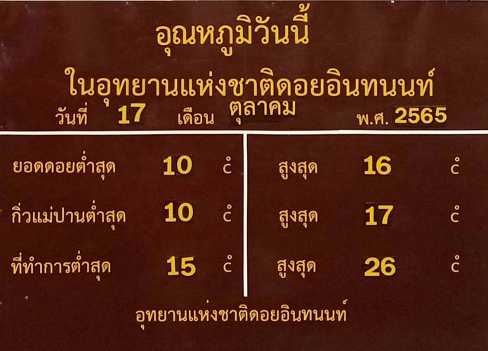 ขณะที่ตามยอดดอยหลายแห่งเช้านี้อุณหภูมิลดลงมาอย่างต่อเนื่อง โดยเฉพาะที่ยอดดอยอินทนนท์ อ.จอมทอง จ.เชียงใหม่ ทางอุทยานแห่งชาติดอยอินทนนท์รายงานสภาพอากาศ และบรรยากาศการท่องเที่ยวมาว่า เช้านี้ทั้งที่ยอดดอยอินทนนท์ และที่กิ่วแม่ปานอุณหภูมลดลงมาอยู่ที่ 10.0 องศาเซลเซียส นักท่องเที่ยวได้สัมผัสอากาศหนาว และชมแสงสีทองของพระอาทิตย์ขึ้นยามเช้าได่อย่างสวยงามเนื่องจากท้องฟ้าเปิดอากาศสดใส และมีแนวโน้มว่าอุณหภูมิจะลดลงได้อกในช่วง 1-2 วันนี้
