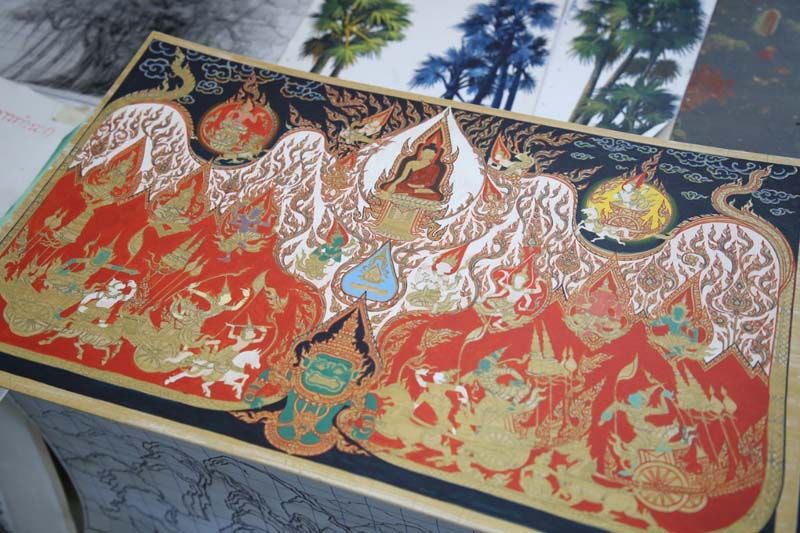 “ตลอดจนในส่วนของงานจิตรกรรมฉากที่ออกแบบและเขียนขึ้นใหม่เกือบทั้งหมด เนื่องจากฉากเดิมมีการชำรุด ทรุดโทรมตามกาลเวลาโดยมีทีมงานเขียนฉากของอาจารย์ วิชัย รักชาติ ที่ระดมช่างเขียนฝีมือดีมาช่วยกันสร้างสรรค์ฉากให้สวยสมบูรณ์แบบเช่น ฉากวิมานของเทวดา นางฟ้าที่งดงามตระการตา และฉากม่านพระ ที่ต้องออกแบบและทำขึ้นใหม่แทนฉากเดิมที่ทอด้วยพรมของอาจารย์จักรพันธุ์ โปษยกฤตซึ่งชำรุดเสียหายไปหมดเล้วเป็นต้น”