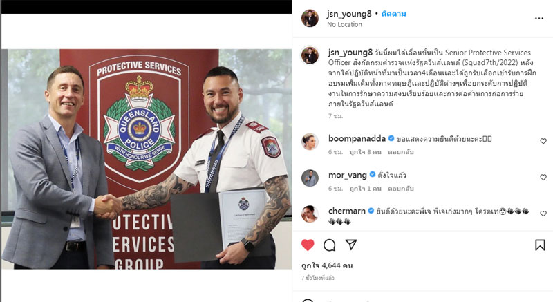 โดย เจสัน ยัง โพสต์ภาพและข้อความว่า ” วันนี้ผมได้เลื่อนขั้นเป็น Senior Protective Services Officer สังกัดกรมตำรวจเเห่งรัฐควีนส์เเลนด์ (Squad7th/2022) หลังจากได้ปฏิบัติหน้าที่มาเป็นเวลา 4 เดือนเเละได้ถูกรับเลือกเข้ารับการฝึกอบรมเพิ่มเติมทั้งภาคทฤษฎีเเละปฏิบัติต่างๆเพื่อยกระดับการปฏิบัติงานในการรักษาความสงบเรียบร้อยเเละการต่อต้านการก่อการร้ายภายในรัฐควีนส์เเลนด์ “