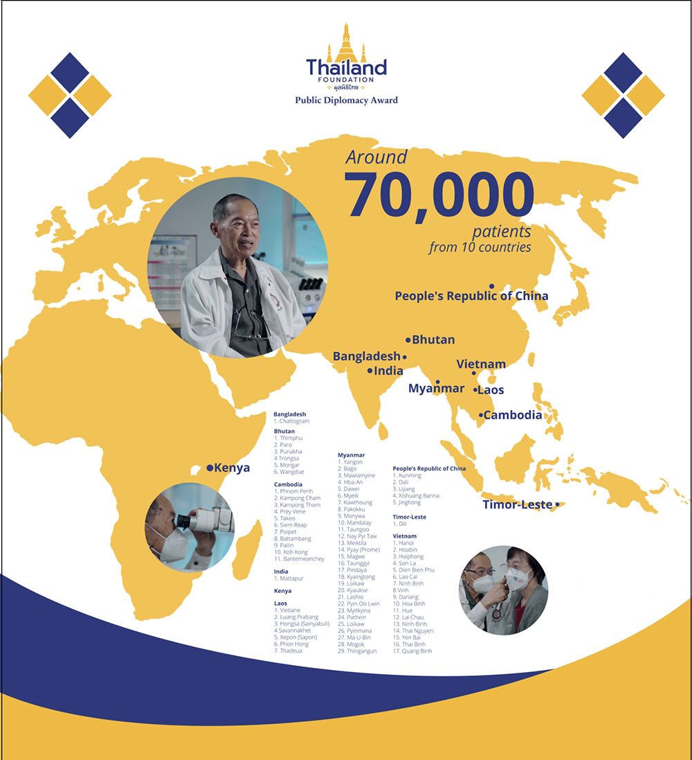 ด้าน นพ.สุนทร อันตรเสน ผู้จัดตั้งหน่วยแพทย์อาสาไปรักษาผู้ป่วยโรคหูน้ำหนวกในประเทศต่างๆ โดยเฉพาะประเทศเพื่อนบ้านของไทย ตลอดระยะเวลามากกว่า 30 ปี อาทิ ลาวกัมพูชา เวียดนาม เมียนมา จีนตอนใต้ อินเดียเคนยา บังกลาเทศ ภูฏาน ติมอร์ตะวันออก รวมแล้วมากกว่า 80 เมือง ใน 10 ประเทศ และรักษาผู้ป่วยไปแล้วกว่า 70,000 ราย “ผมเริ่มสนใจเรื่องหน่วยแพทย์อาสา ตั้งแต่ตอนที่ไปอยู่โรงพยาบาลต่างจังหวัด สมัยนั้นมีแต่โรงพยาบาลจังหวัด ไม่มีโรงพยาบาลอำเภอ คนไข้จึงหาหมอยาก แล้วตอนที่ผมกลับมาจากศึกษาต่อที่ต่างประเทศ เมืองไทยมีหมอเฉพาะทางโรคหูแค่10 กว่าคน ถือว่าน้อยมาก แล้วคนก็เป็นโรคหูน้ำหนวกกันเยอะ ผมเลยชวนเพื่อนๆ ตั้งกลุ่มแพทย์อาสากลุ่มเล็กๆ เริ่มจากใช้ทุนทรัพย์ส่วนตัว ไปรักษาคนไข้ตามต่างจังหวัดประมาณ 10 กว่าปี หลังจากนั้นก็เริ่มเดินทางไปรักษาโรคนี้ให้กับผู้ป่วยในต่างประเทศ เริ่มจากเมืองคุนหมิง ประเทศจีนต่อมาก็ที่พม่า กัมพูชา แล้วก็ติดพันยาวนานมากกว่า 30 ปี โดยระยะหลังจะเน้นที่ประเทศเพื่อนบ้านติดชายแดนไทย เพราะน่าจะช่วยให้ความสัมพันธ์ระหว่างไทยและประเทศเพื่อนบ้านแน่นแฟ้นยิ่งขึ้นด้วย” นพ.สุนทรผู้ได้รับรางวัลการทูตสาธารณะกล่าว