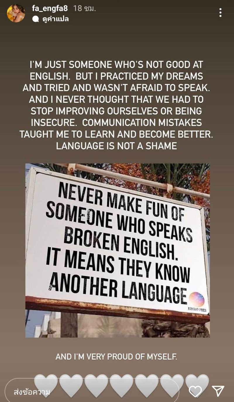 ล่าสุด อิงฟ้า วราหะ ได้เคลื่อนไหวผ่านไอจีสตอรี่ด้วยข้อความภาษาอังกฤษแปลได้ว่า “อย่าล้อเลียนคนที่พูดภาษาอังกฤษผิด เพราะมันหมายความว่า พวกเขารู้ภาษาอื่น พร้อมระบุว่าเธอก็คนหนึ่งที่ไม่เก่งอังกฤษ แต่ฝึกฝนและพยายามเพื่อความฝัน และไม่กลัวที่จะพูด ไม่เคยคิดที่จะหยุดพัฒนาตนเอง และเธอก็ภูมิใจในตัวเองมาก”