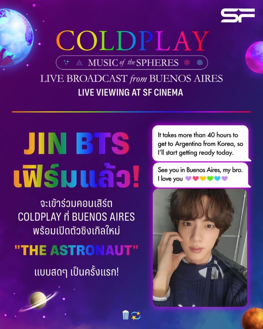 โรงภาพยนตร์ในเครือ เอส เอฟเอาใจแฟนคลับวงร็อคระดับโลก COLDPLAY (โคลด์เพลย์)เตรียมฉาย “COLDPLAY MUSIC OF THE SPHERES LIVE BROADCAST FROM BUENOS AIRES : LIVE VIEWING AT SF CINEMA” ถ่ายทอดสดการแสดงคอนเสิร์ตจากเมืองบัวโนสไอเรส ประเทศอาร์เจนตินา มาให้ชาวไทยได้ดูพร้อมกับแฟน ๆ อีกกว่า 70 ประเทศทั่วโลก บนจอยักษ์พร้อมระบบเสียงสมบูรณ์แบบ พร้อมเซอร์ไพรส์กับแขกรับเชิญสุดพิเศษ “จิน BTS (JIN)”ที่จะมาร่วมสร้างความมันส์ ในวันที่ 29 ตุลาคม 2565 รอบเวลา 15.30 น. และ 19.00 น. เฉพาะที่โรงภาพยนตร์ในเครือ เอส เอฟ เท่านั้น“MUSIC OF THE SPHERES”เป็นคอนเสิร์ต World Tourครั้งล่าสุดของ Coldplayวงดนตรีร็อกชื่อดังสัญชาติอังกฤษ โดยจะจัดขึ้นที่สนามกีฬา River Plateเมืองบัวโนสไอเรส ประเทศอาร์เจนตินา ต่อหน้าแฟนคลับกว่า 100,000 คนในวันที่ 28 ตุลาคม 2565 (ตามเวลาท้องถิ่น) พร้อมความพิเศษของ World Tour ในครั้งนี้คือจะมีการถ่ายทอดสดให้แฟนเพลงได้รับชมในโรงภาพยนตร์กว่า 70ประเทศทั่วโลก สำหรับประเทศไทยโรงภาพยนตร์ในเครือ เอส เอฟ เป็นโรงภาพยนตร์แห่งเดียวที่ได้รับสิทธิ์ในการถ่ายทอดสดครั้งนี้โดยได้จัดฉายไปยัง 10 สาขาของโรงภาพยนตร์ในเครือ เอสเอฟ ทั่วประเทศ แบ่งออกเป็น 2 รอบฉายคือ 15.30น. และ 19.00 น. ในวันศุกร์ที่ 29 ตุลาคม 2565