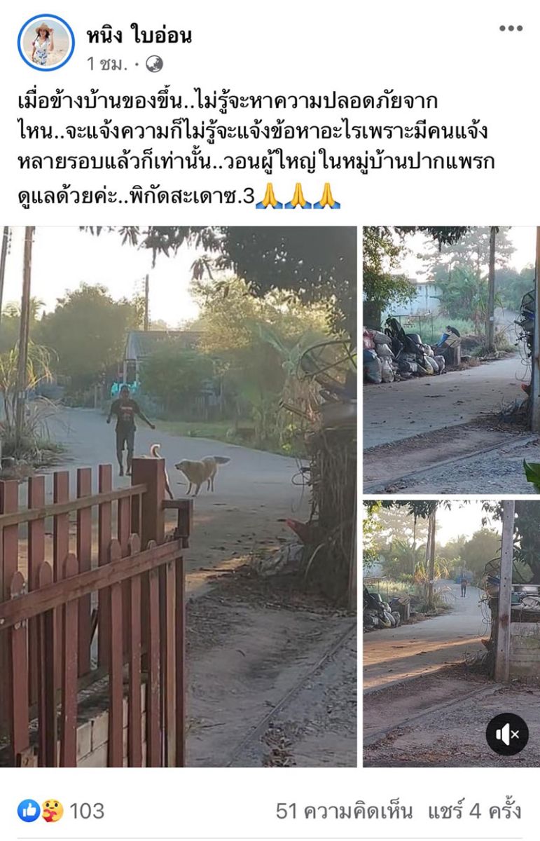 “เมื่อข้างบ้านของขึ้น..ไม่รู้จะหาความปลอดภัยจากไหน..จะแจ้งความก็ไม่รู้จะแจ้งข้อหาอะไรเพราะมีคนแจ้งหลายรอบแล้วก็เท่านั้น..วอนผู้ใหญ่ในหมู่บ้านปากแพรกดูแลด้วยค่ะ..พิกัดสะเดาซ.3”