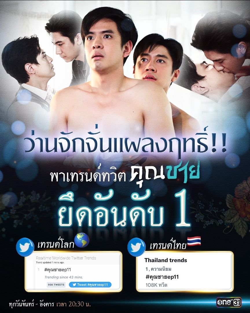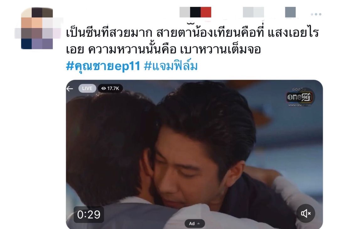 ปัง!!! เต็มคาราเบลยาวไป ตั้งแต่ 2 ทุ่ม ยัน เที่ยงคืน สำหรับ ละครฟอร์มใหญ่ “คุณชาย” ทาง ช่องวัน31 ที่ทำเอาเบาหวานขึ้นตาหนักมาก สำหรับ EP.11 (7 พย) กับ ฉากเลิฟซีนสุดช็อตฟีล ที่ละมุน สวยงาม โดนใจแฟนละครอย่างแรง เพราะการแสดงของ “ฟิล์ม-ธนภัทร กาวิละ” และ “แจม-รชตะ หัมพานนท์” ที่ถ่ายทอดฉากเลิฟซีนให้ออกมาดูสวยงาม อ่อนโยน โดยเฉพาะ งานสายตาที่ทั้งคู่เล่นได้ละเอียด นุ่มนวล ชวนฟินขั้นสุด จนพาเรตติ้ง พุ่งแตะ 2.24 (15+NW) , 2.63 (15+BKK) และ 2.27 (15+URBAN) ที่สำคัญ ยังยืนหนึ่งความแรงในทุกช่องทางโซเชี่ยล ไม่ว่าจะเป็น เทรนด์ทวิตเตอร์อันดับหนึ่งของโลก , weibo อันดับหนึ่งของจีน และ เทรนด์ทวิตเตอร์ไทยแลนด์ ก็ยังครองแชมป์อันดับหนึ่งได้อย่างต่อเนื่อง รวมถึง ควบรวมความปัง หลังละครจบ หนุ่ม “นุนิว” ขยี้ความฟินต่อเนื่อง ด้วยการมาโชว์ร้องเพลง “รักแท้” ซึ่งเป็นเพลงประกอบละคร “คุณชาย” ในรายการ “SOUNDCHECK” เรียกว่า เพลงแรงฮิต ติดชาร์ตไม่พอ เพราะล่าสุด เอ็มวีกำลังพุ่งทะยานเข้าสู่ยอด 27 ล้านวิว โอ๊ย!! ยืนหนึ่งความปังรอบด้านขนาดนี้ อะไรก็ฉุดไม่อยู่แล้วจ้า