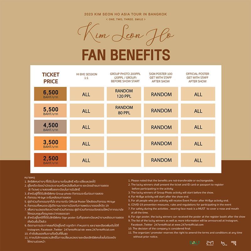 นักแสดงหนุ่ม “คิมซอนโฮ (KIM SEON HO) ที่ได้รับความรักมากมายจากแฟนๆ ผ่านบทบาท หัวหน้าฮง ชายหนุ่มสุดเท่ พร้อมรอยยิ้มสดใส ผู้เป็นทุกอย่างในซีรีส์โรแมนติกเรื่องดัง HOMETOWN CHA CHA CHA พร้อมมาพบปะกับแฟนๆ ชาวไทยอย่างเป็นทางการครั้งแรกกับงานแฟนมีตติ้ง 2023 KIM SEON HO ASIA TOUR IN THAILAND < ONE, TWO, THREE. SMILE >โดยงานจะเกิดขึ้นวันเสาร์ที่ 11 กุมภาพันธ์ 2566 จัดที่ QUEEN SIRIKIT NATIONAL CONVENTION CENTER ผู้จัดครั้งนี้คือ บริษัทคนรุ่นใหม่อย่าง 247 ENTERTAINMENT และจะทำการเปิดจองบัตร ในวันเสาร์ที่ 19 พฤศจิกายน 2565 เวลา 10:00น. ผ่านช่องทางของ ALLTICKET ไม่ว่าจะเป็นหน้าเคาท์เตอร์หรือเว็ปไซต์ https://www.allticket.com/ โดยบัตรจะมีราคา 6,500/ 5,500/ 4,500/ 3,500/ 2,500บาท สามารถติดตามรายละเอียดเพิ่มเติมได้ที่ 247 ENTERTAINMENT