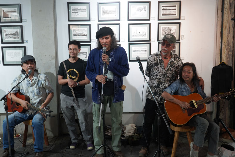 ท่ามกลางภาพวาดลายเส้นขาวดำกว่า 200 ภาพ ในบรรยากาศที่เป็นกันเอง เพราะเจ้าของงานอยากให้ทุกคนที่มาร่วมเป็นประธานร่วมกัน นอกจากนี้ยังมีดนตรีสดๆ ขับกล่อมสลับกับการอ่านบทกวี โดยเปิดเวทีบรรเลงจากนักเขียน-นักดนตรีอย่าง นกน้อย-ชูเกียรติ ฉาไธสง,ต๋วง-จามิกร แสงศิริ,เดช อัสดง,ดิเรก นนทชิต, เสียงเป่าฟลุ๊ตของ น้องนัช-หาญพานิชพันธุ์ ฯลฯ ไปจนถึงเซอร์ไพร์สจากลูกสาว “เพลงน้ำ พันธุ์พิพัฒน์” ที่ถูกเชื้อเชิญให้ออกมาร้องเพลงให้พ่อ โดยที่เธอก็ไม่รู้ตัวมาก่อน แต่ก็สร้างความรู้สึกที่อบอุ่นให้กับผู้ร่วมงานไม่น้อย