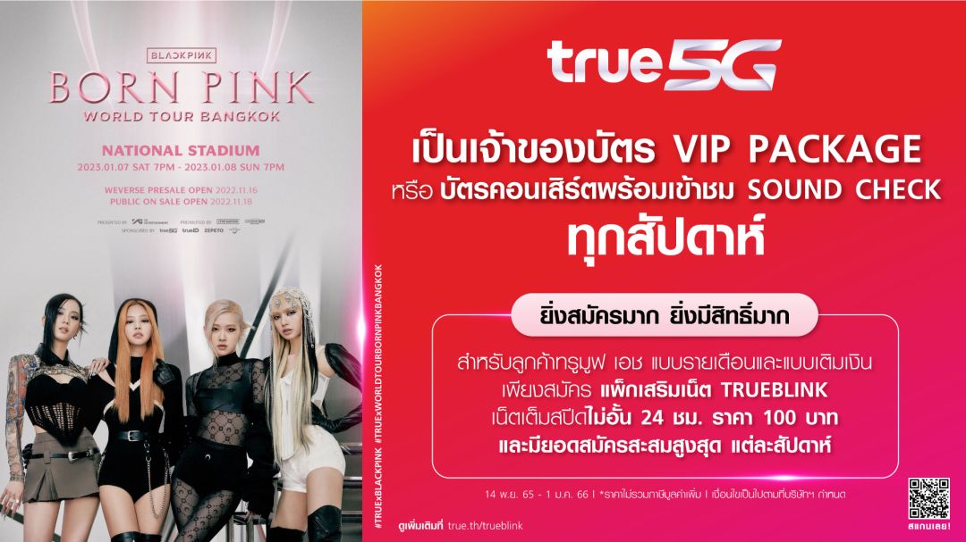 พิเศษ 1 : ลูกค้าทรูมูฟ เอชทั้งแบบรายเดือนและเติมเงิน เพียงสมัครแพ็กเกจเสริมเน็ต TRUEBLINK 5G ราคา 100 บาท (ได้เน็ตเต็มสปีดไม่อั้น 24 ชม.) และมียอดสะสมซื้อสูงสุดในแต่ละสัปดาห์ ลุ้นรับ VIP Package (มูลค่า 9,600 บาท) หรือบัตรคอนเสิร์ต (มูลค่า 6,600 หรือ 5,800 บาท) พร้อมสิทธิ์เข้าชมรอบ Sound Check “BLACKPINK WORLD TOUR [BORN PINK] BANGKOK” ทุกสัปดาห์ และผู้ที่มียอดซื้อสะสมสูงสุด 2 ลำดับแรกตลอดระยะเวลากิจกรรม รับไปเลย ซีดี และโปสเตอร์ พร้อมลายเซ็นของ 4 สาว สมัครง่ายๆ ผ่านเว็บ tmvh.co/c282 หรือที่ True iService คลิก https://bit.ly/TrueiSVxBLINK สำหรับลูกค้าแบบเติมเงิน สามารถกดสมัครผ่าน *900*5000# โทรออก รีบเลย…เปิดซิมทรูมูฟ เอชแล้วกดสมัครวันนี้ ลุ้นผลทันทีทุกสัปดาห์ที่ https://www.true.th/trueblink/campaign/41