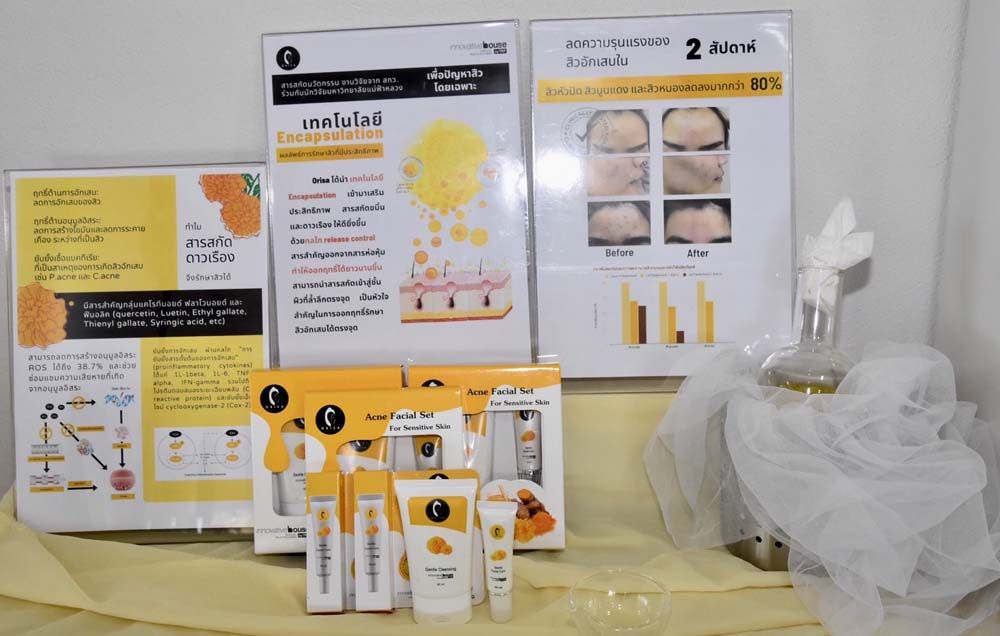 นางสาวอนงค์นุช ต๊ะคำ กล่าวว่า บริษัท คอสเม่ อินโนเวชั่น จำกัด ได้ร่วมกับนักวิจัยศึกษาและพัฒนาผลิตภัณฑ์เครื่องสำอางจาก ดาวเรือง ขมิ้นชัน และน้ำผึ้ง ให้มีส่วนประกอบของสารสกัดที่มีความคงตัว สามารถรักษาสิวได้อย่างมีประสิทธิภาพ ช่วยเพิ่มความชุ่มชื้นฟื้นฟูผิวให้กลับมามีสุขภาพดี ปลอดภัยไม่ก่อให้เกิดการระคายเคืองและสามารถใช้ได้กับทุกสภาพผิวแม้ผิวแพ้ง่าย ในรูปแบบสบู่เหลวล้างหน้าและเซรั่มบำรุงผิวหน้าที่มีสารสกัดดาวเรือง ขมิ้นชันและน้ำผึ้ง รวมถึงให้ศึกษาความเป็นไปได้ทางการตลาดของผลิตภัณฑ์ เพื่อเป็นข้อมูลต่อยอดทางธุรกิจและส่งเสริมให้เกิดการขายจริงในเชิงพาณิชย์