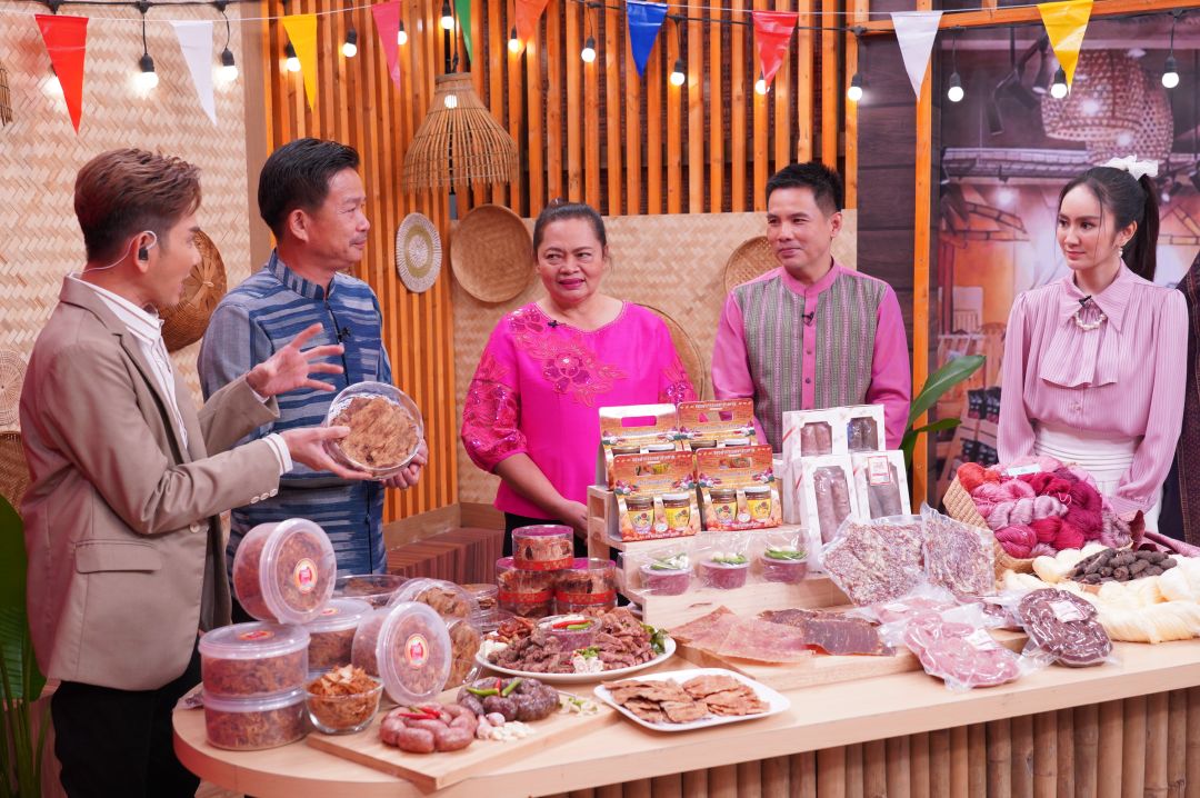 ซึ่งคุณเกียรติศักดิ์ ตรงศิริ ผู้ว่าราชการจังหวัดมหาสารคามก็ไม่รอช้าเลยอาสาเป็นตัวแทนชาวมหาสารคาม พาเอ แป้งมารู้จักเมนูขึ้นชื่อแถมคุณภาพระดับพรีเมียมอย่างหมูทุบ เนื้อทุบ จากร้านบ้านแพงรสเด็ด 2 เป็นของกินที่ดีต่อสุขภาพ มีมันในเนื้อค่อนข้างน้อยแถมกระบวนการปรุงรส หมักด้วยเครื่องเทศกับเนื้อเข้าด้วยกันจนเป็นเนื้อเดียวไม่ว่าจะทานตรงส่วนไหน รับประกันรสชาติก็เหมือนกัน ต่อด้วยหม่ำเนื้อ หม่ำหมู ไส้กรอกหมู ไส้กรอกเนื้อ ที่รสชาติอร่อยเหาะ จนแขกไปใครมาต้องแวะซื้อ แวะชิม แถมกลิ่นก็หอมหวน รัญจวนใจ ยิ่งใช้เนื้อสะโพกอย่างเดียว ไม่มีเนื้อส่วนอื่นผสม เนื้อจะนิ่ม และอร่อย แถมเป็นเกรดดีที่สุดที่ไม่เหมือนใคร และอีกหนึ่งไฮไลท์เมนูเนื้อคือเนื้อหนอกเป็นซุปเปอร์ไฮไลท์ การันตีใครได้ทาน ต่างก็ติดใจแบบถอนตัวไม่ขึ้นและไม่ว่าเมนูไหน ที่นำมาจิ้มมาผสมกับปลาร้าบองสมุนไพร ปลาร้าเลิศรสก็จะยิ่งติดใจหนักขึ้นแถมกลิ่นสมุนไพรก็หอมชวนทานต่อด้วยอาหารใจ แถมให้กายอบอุ่นอย่างผ้าไหมลายสร้อยดอกหมาก เป็นงานหัตถกรรมจากชาวบ้าน ทอด้วยกี่ไม้โบราณ โดยใช้เอกลักษณ์การทอแบบดั้งเดิม สีที่ได้มาจากครั่งที่เลี้ยงบนต้นจามจุรี ถือเป็นราชาแห่งสีย้อม ส่วนไหมก็เป็นไหมที่เลี้ยงกันในชุมชน และใครจะไปรู้ว่าผ้าทอของจังหวัดมหาสารคามจะมีมูลค่าหลักแสน แต่ก็ไม่น่าแปลกใจ เพราะไม่ใช่แค่สวย แต่มีคุณค่าของความภาคภูมิใจของผู้ทอ ที่ตั้งใจทำไปเป็นเครื่องห่มให้ผู้ส่วมใส่ใช้ประดับร่างกายได้สวยงามอีกด้วย เรียกว่ามีทั้งของดีด้านอาหาร และเครื่องห่มเลยทีเดียวกินอย่างไร ก็อิ่มบ่เป็น!
