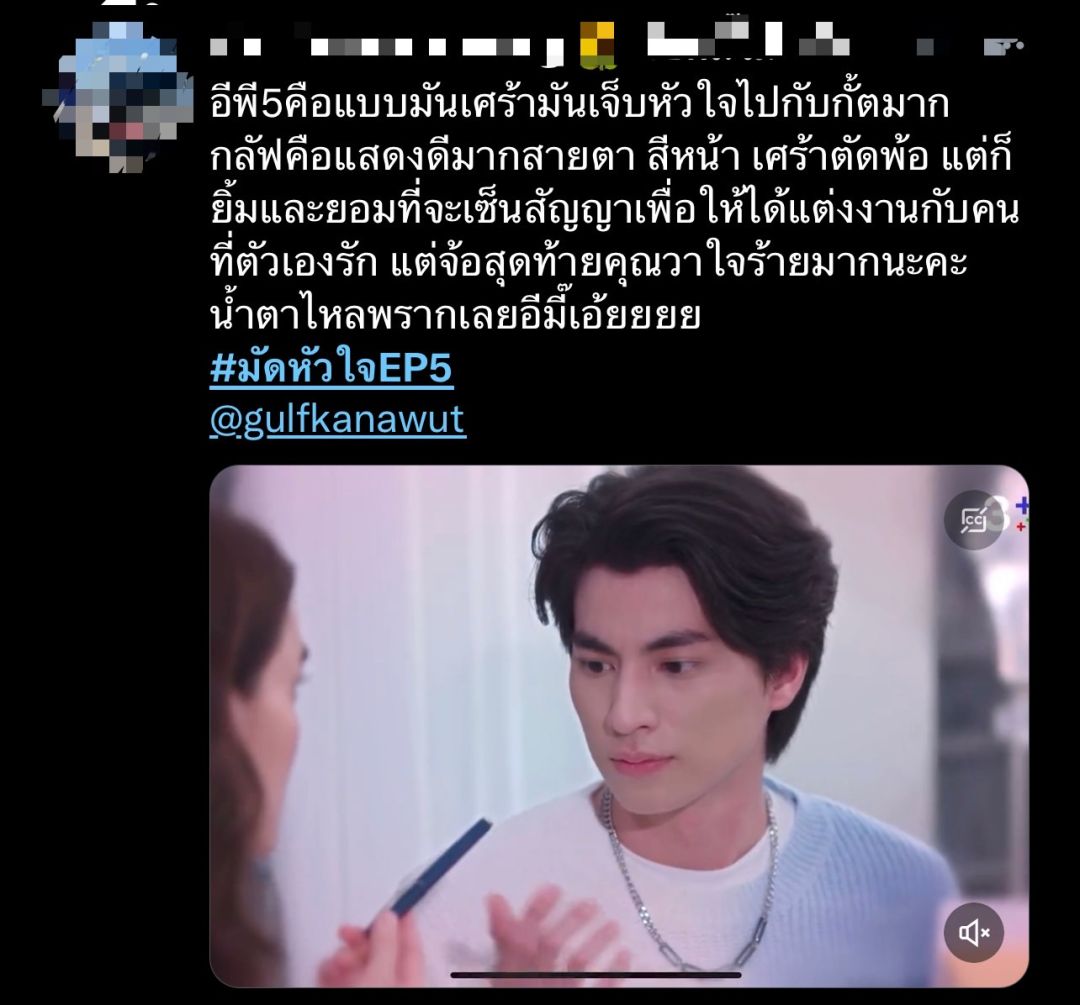 เรียกว่ายิ่งฉายยิ่งปังจริงๆ กับ อีพี 5ที่ทำให้แฟนๆ สะอื้นกันเป็นแถวกับฉากปล่อยโฮของหนุ่ม กั๊ต(กลัฟ คณาวุฒิ)เมื่อ คุณวา หรือ วาสิตา(เจนี่ เทียนโพธิ์สุวรรณ์)ร่างสัญญาข้อตกลงการแต่งงานไม่ให้กั๊ตมีสิทธิในการดูแลบุตร กลายเป็นฉากท็อปฟอร์มมากกับการแสดงสีหน้า อารมณ์ มุมอบอุ่นอ่อนโยน หรือจะเป็นพ่อหนุ่มคลั่งรักก็ทำแฟนๆ อินหนักมากจนอยากจะต่อแถวลงชื่อเป็นคุณวากันเป็นแถว! และสัญญาปวดใจครั้งนี้ก็สร้างปรากฏการณ์น้ำตาคลอเบ้าไว้เต็มโลออนไลน์