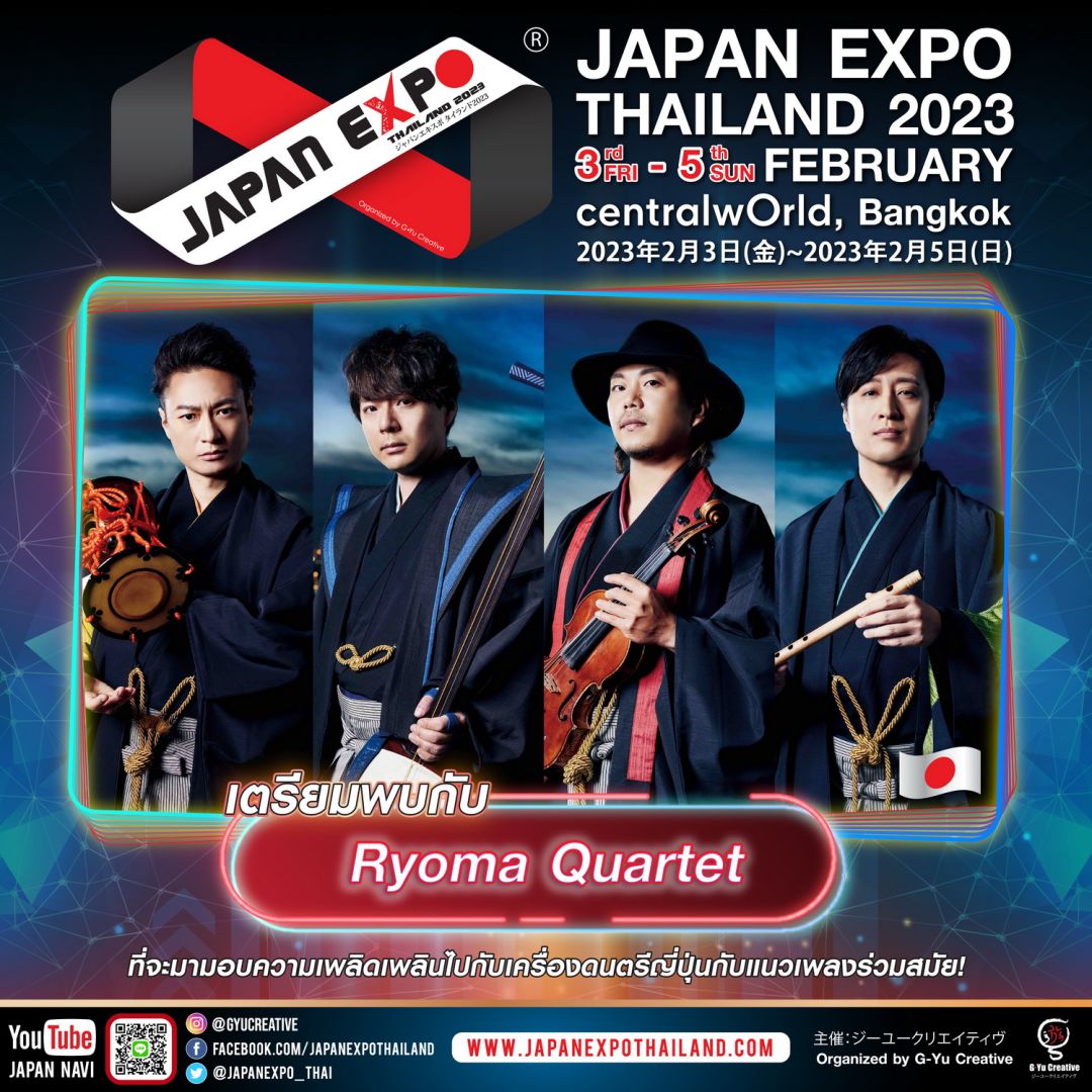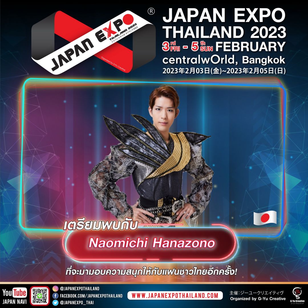 ห่างหายกันไปหลายปี สำหรับศิลปินจากแดนอาทิตย์อุทัยอย่างNaomichiHanazono(นาโอมิจิฮานาโซโนะ)และศิลปินกลุ่ม Ryoma Quartet (เรียวมะควอเทท)ที่แอบขโมยหัวใจสาวไทยและหนุ่มไทยกันไปเมื่อหลายปีก่อน กลับมาคราวนี้จัดหนัก จัดเต็ม เพื่อให้แฟนๆ ชาวไทยได้หายคิดถึงกัน และเป็นการฉลองครบรอบ 8 ปี มหกรรมญี่ปุ่นที่ยิ่งใหญ่ที่สุดในเอเชีย! JAPAN EXPO THAILAND 2023 จัดโดย บริษัท จี-ยู ครีเอทีฟ จำกัด บริษัทอีเว้นท์ญี่ปุ่นที่ยิ่งใหญ่ที่สุดในเอเชียภายใต้ธีมEMPOWER INFINITYการเสริมพลังซึ่งกันและกันอย่างไม่มีที่สิ้นสุด ด้วยความร่วมมือระหว่างประเทศไทยและญี่ปุ่นที่ทุกคนรอคอย!!!ที่จะขึ้นตลอด 3 วันเต็ม ระหว่างวันศุกร์ที่ 3 – วันอาทิตย์ที่ 5 กุมภาพันธ์ 2566 ณ ศูนย์การค้าเซ็นทรัลเวิลด์