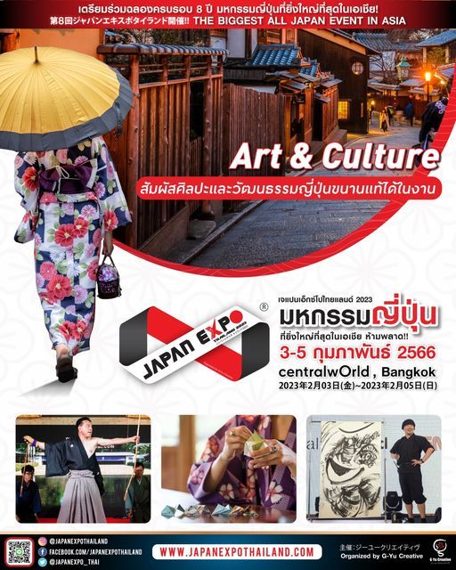 พลาดไม่ได้!!!เตรียมพบกับกองทัพศิลปินญี่ปุ่นและความสนุกสนานทั้ง 17 โซน พร้อมกิจกรรมมากมายตลอด 3 วันเต็ม!!วันศุกร์ที่ 3 – วันอาทิตย์ที่ 5 กุมภาพันธ์ 2566 ณ ศูนย์การค้าเซ็นทรัลเวิลด์ ติดตามความเคลื่อนไหวของงานได้ที่ https://www.gyucreative.com/japanexpothailand2023