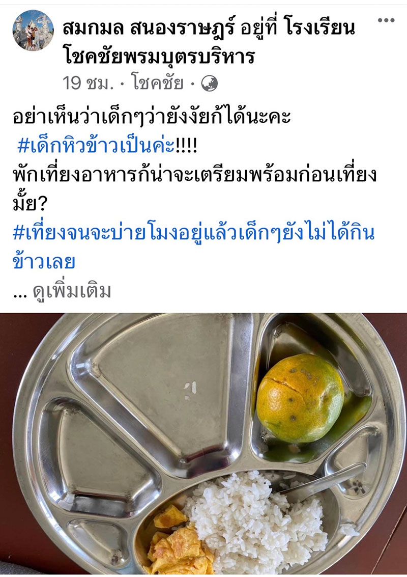 14 ธันวาคม 2565 จากกรณีที่มีผู้ใช้เฟสบุ๊คชื่อ สมกมล สนองราษฎร์ ได้โพสต์ภาพอาหารกลางวัน พร้อมระบุข้อความด้วยว่า