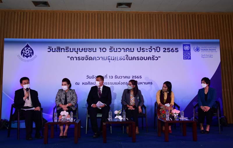 สำนักงานคณะกรรมการสิทธิมนุษยชนแห่งชาติ (กสม.) ร่วมกับสำนักงานข้าหลวงใหญ่เพื่อสิทธิมนุษยชนแห่งสหประชาชาติ (OHCHR) ประจำภูมิภาคเอเชียตะวันออกเฉียงใต้และโครงการพัฒนาแห่งสหประชาชาติ (UNDP) ประเทศไทย และภาคีเครือข่าย จัดงานวันสิทธิมนุษยชน 10 ธันวาคม ประจำปี 2565 ภายใต้แนวคิด “การขจัดความรุนแรงในครอบครัว” เมื่อวันที่ 13 ธ.ค. 2565 ที่ผ่านมา ณ หอศิลปวัฒนธรรมแห่งกรุงเทพมหานคร โดยหนึ่งในกิจกรรมของงาน คือวงเสวนาหัวข้อ “ร่วมสร้างสังคมที่ปราศจากความรุนแรงในครอบครัว” มีวิทยากร 5 ท่านเข้าร่วม และมี วสันต์ ภัยหลีกลี้ กรรมการสิทธิมนุษยชนแห่งชาติ เป็นผู้ดำเนินรายการ