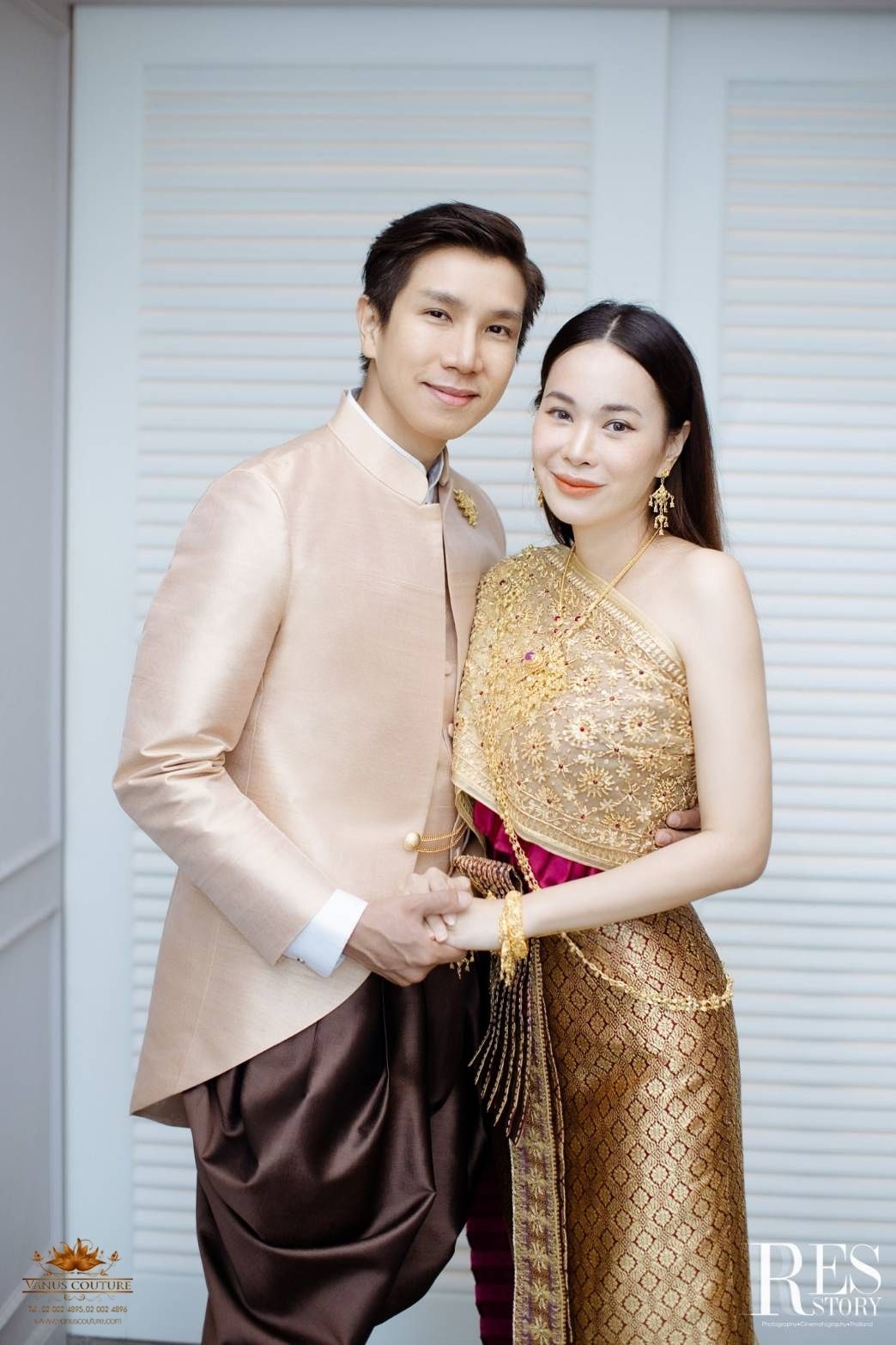 เปิดตัวด้วยชุดตักบาตรเช้า เจ้าสาวมาในลุคชุดไทยจักรพรรดิสีโรสโกลด์ ที่ตัดเย็บด้วยผ้าไหมลำพูนสอดดิ้นทอง ที่สั่งทอขึ้นมาใหม่ทั้งผืน ส่วนของสไบสีทองนั้นปักด้วยลายดอกดาวเรือง และเพิ่มความหรูหราให้สไบด้วยงานปักลูกปัดสีแดง (ซึ่งตามความเชื่อของชาวจีน ดอกดาวเรืองเป็นดอกไม้มงคล สีเหลืองทองอร่ามของดอกดาวเรืองเปรียบเสมือนเงินทองเต็มบ้านที่ช่วยเสริมความเจริญรุ่งเรือง เงินทอง โชคลาภ กิจการใด ๆ ก็จะก้าวหน้ายิ่ง ๆ ขึ้นไปนั้นเอง) ส่วนเจ้าบ่าวนั้นมาในลุคชุดไทยประยุกต์ สีโรสโกลด์ตัดกับโจงกระเบนสีน้ำตาลเหลือบทอง เป็นลุคชุดไทยที่หล่อและสวยงามแพคคู่เหมาะสมกันมากๆทีเดียว