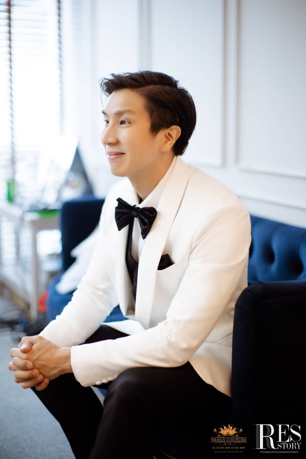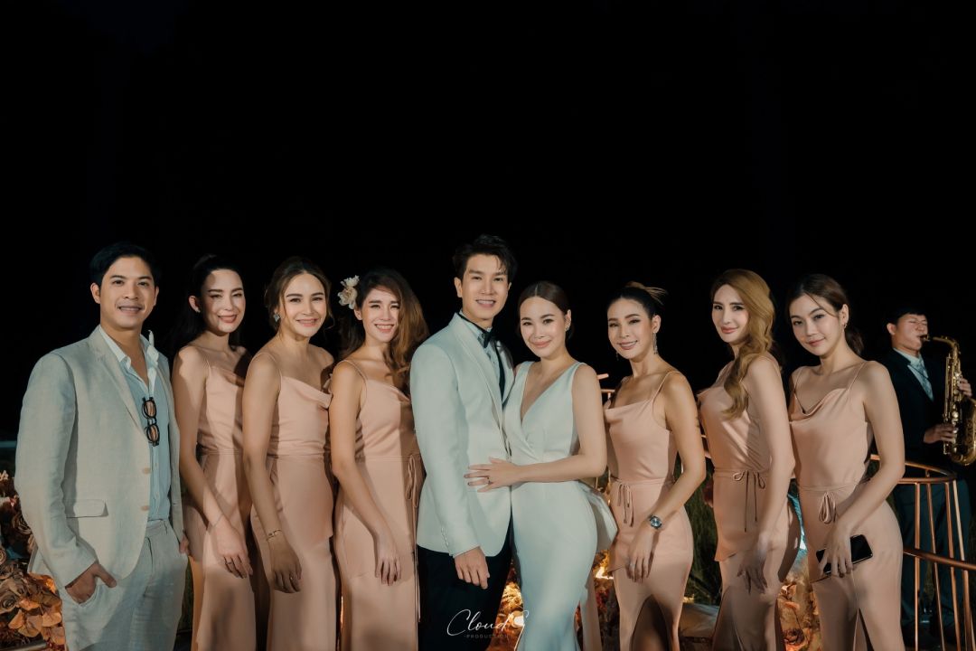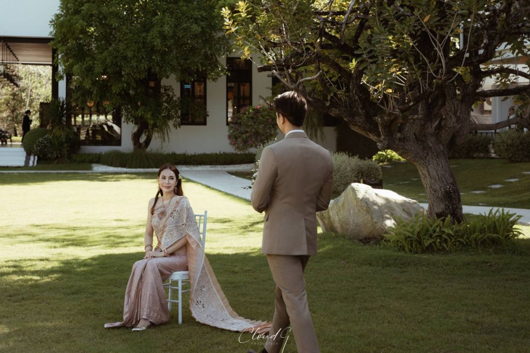 ส่วนชุดไทยอีกชุดในพิธีรดน้ำสังข์นั้น สาวโบวี่เลือกใช้ชุดไทยจักรพรรดิอีกเช่นกัน ตัดเย็บจากผ้าไหมพาราณสี สีชมพูพาสเทล เป็นชุดไทยแบบนุ่งสด ปักด้วยคริสตัลสีโรสโกลด์ทั้งชุด เป็นอีกหนึ่งชุดไทยที่สวยหรูหราเหมาะกับเจ้าสาวมาก ๆ ส่วนเจ้าบ่าวนั้นมาในลุคชุดสูทสีน้ำตาลสุดเรียบหรู ที่ออกแบบมาให้เหมาะกับเจ้าบ่าวโดยเฉพาะ เสริมลุคให้ดูสมาร์ท อบอุ่น หล่อเนี๊ยบสมกับเจ้าสาวคนสวยมาก ๆ ทีเดียว