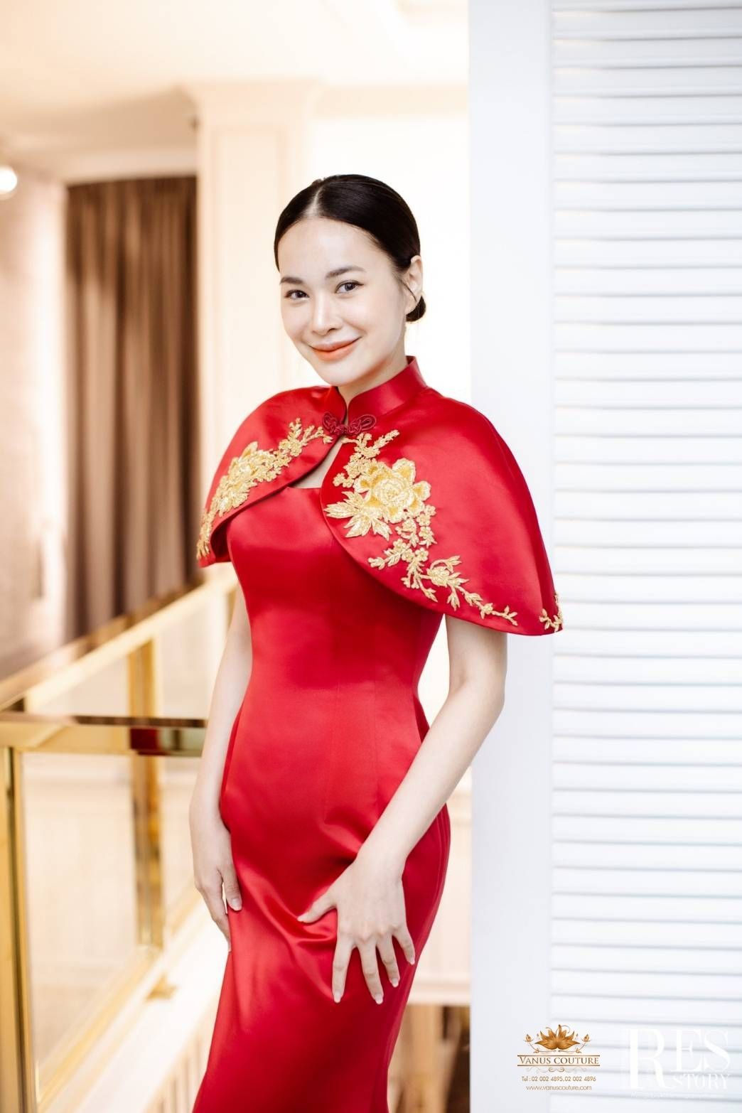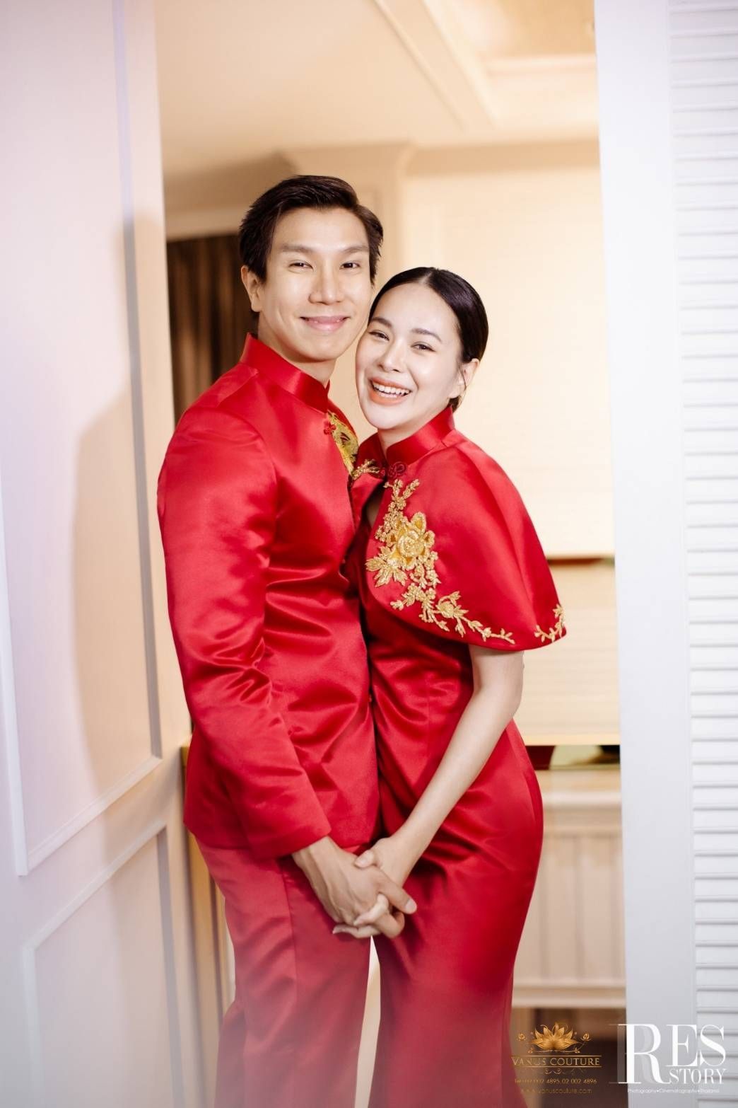 ปิดท้ายด้วยชุดยกน้ำชา เจ้าสาวมาในชุดเมอร์เมดเกาะอกสีแดง เพิ่มเลเยอร์ด้วยเสื้อปิดไหล่อีกชั้นเพิ่มความหรูหราด้วยด้วยงานปักด้ายทองเป็นรูปดอกโบตั๋น เพื่อแสดงถึงความเป็นเจ้าสาวคนสวยของงาน ส่วนชุดสีแดงของเจ้าบ่าว เพิ่มดีเทลด้วยงานปักด้ายทองเป็นรูปมังกร เพื่อสื่อถึงความแข็งแรงและความเป็นผู้นำครอบครัว