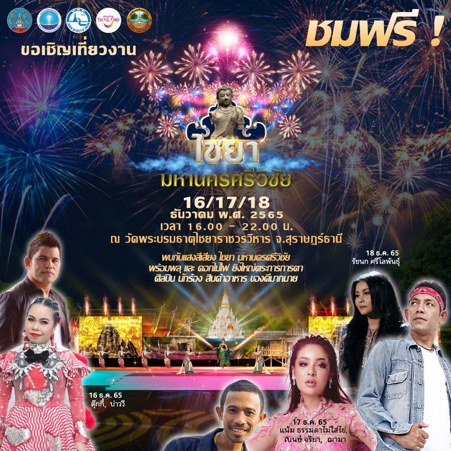 กระทรวงการท่องเที่ยวและกีฬา โดยการท่องเที่ยวแห่งประเทศไทย ร่วมกับหน่วยงานพันธมิตร ทั้งภาครัฐและเอกชน อาทิ จังหวัดสุราษฎร์ธานี, เทศบาลตำบลเวียง, วัดพระบรมธาตุไชยาราชวรวิหาร, บริษัท ไอ-อีเวนท์ จำกัด จัดงาน “ไชยา มหานครศรีวิชัย” ณ วัดพระบรมธาตุไชยา ราชวรวิหาร ตำบลเวียง อำเภอไชยา จังหวัดสุราษฎร์ธานี ระหว่างวันที่ 16-18 ธันวาคม 2565 เวลา 16.00-22.00 น. เพื่อสร้างการรับรู้ถึงอัตลักษณ์ทางการท่องเที่ยวในมิติเชิงประวัติศาสตร์ วัฒนธรรม ของจังหวัด สุราษฎร์ธานี และเป็นการแสดงความพร้อมของภาคประชาชนและภาคการท่องเที่ยวของจังหวัดสุราษฎร์ธานีในการรองรับนักท่องเที่ยว ตอกย้ำภาพลักษณ์เมืองแห่งการท่องเที่ยว กระตุ้นให้เกิดการเดินทางท่องเที่ยวนำไปสู่การสร้างเสริมเศรษฐกิจและกระจายรายได้ให้กับประชาชนในพื้นที่ เพื่อพัฒนาสู่การท่องเที่ยวที่มั่นคงและยั่งยืนต่อไป