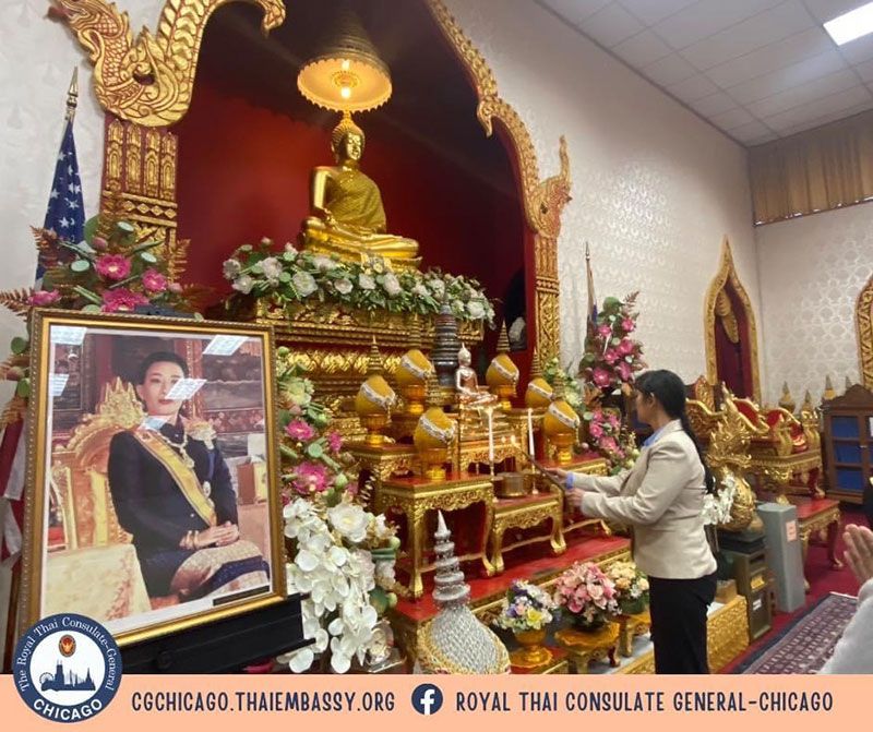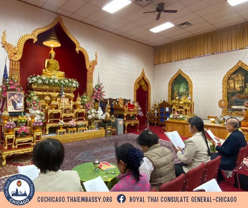 สถานกงสุลใหญ่ไทย ณ นครชิคาโก รัฐอิลลินอย สหรัฐอเมริกา จัดพิธีเจริญพระพุทธมนต์และเจริญจิตตภาวนา ณ วัดธัมมาราม นครชิคาโก ทั้งนี้ วัดธัมมารามฯ กำหนดจะเจริญพระพุทธมนต์และเจริญจิตตภาวนา เพื่อถวายพระพร ต่อเนื่องกับการสวดมนต์ทำวัตรเช้าและทำวัตรเย็นเป็นประจำทุกวันเป็นต้นไป