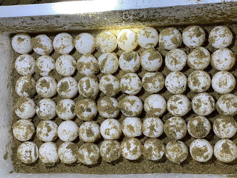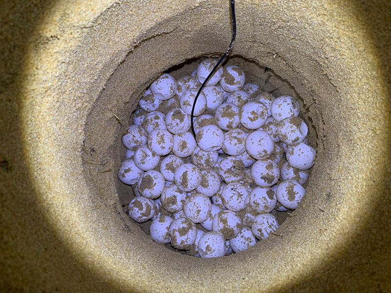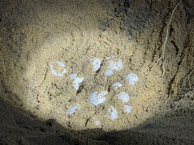 กระทั่งเวลา 18.00 น. จึงพบไข่เต่ามะเฟือง ตรวจสอบบริเวณพื้นที่ของหลุมวางไข่ปรากฎว่า อยู่ในแนวที่น้ำทะเลท่วมถึง ซึ่งจะส่งผลกระทบต่อไข่เต่ามะเฟือง จึงทำการเคลื่อนย้ายพร้อมทั้งตรวจนับไข่เต่ามะเฟืองได้ทั้งสิ้น 138 ฟอง (ไข่ดี 116 ฟอง และไข่ลม 22 ฟอง) นำไปขุดหลุมฟักไข่ใหม่ ในพื้นที่คอกกั้นฟักไข่เต่ามะเฟืองของศูนย์เฝ้าระวังฯ พร้อมทั้งติดตั้งเครื่องวัดอุณหภูมิเพื่อติดตามพัฒนาการของไข่เต่ามะเฟืองต่อไป.012
