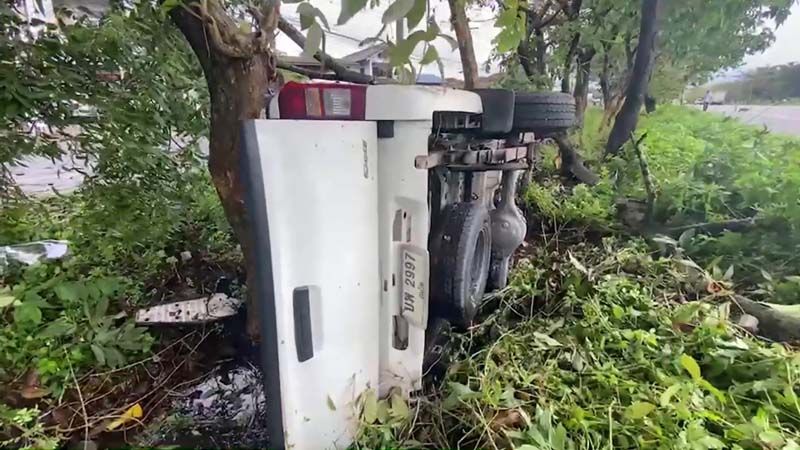 สภาพรถพุ่งลงไปชนติดอยู่กับต้นไม้พลิกตะแคงข้าง ตัวรถด้านหน้าพังเสียหายหนักและต้นไม่ขาด 1 ต้น นอกจากนี้ยังมีรถจักรยานยนต์ที่บรรทุกมาบนท้ายรถเสียหายด้วย