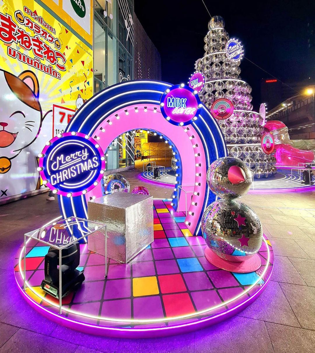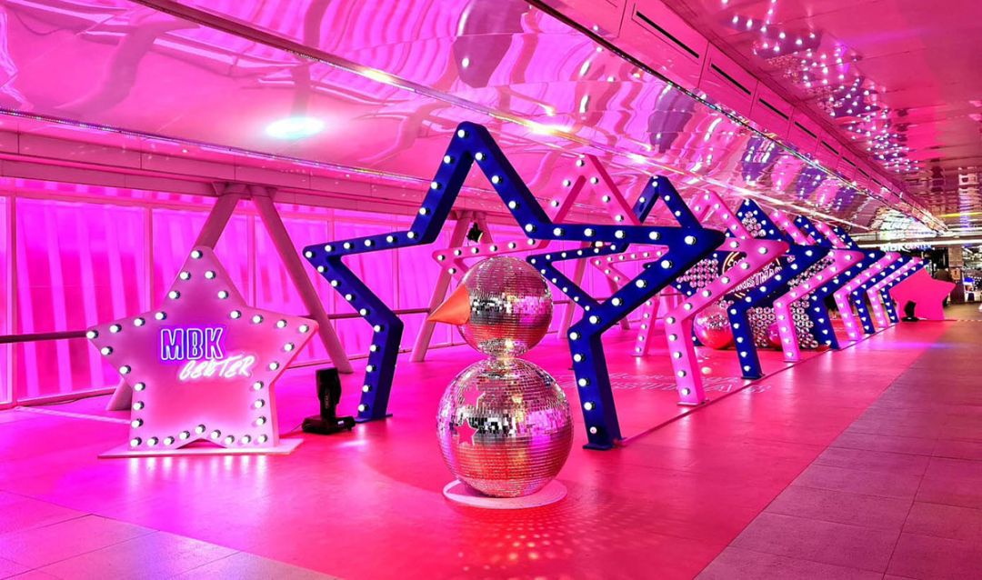 เริ่มที่ เอ็ม บี เค เซ็นเตอร์ ตระการตากับต้นคริสต์มาส ขนาดใหญ่ สูง 9 เมตร บริเวณลานสกาย วอล์ก ประดับไฟหลากสีสัน เพิ่มความสนุกไปกับธีม Disco ด้วยการนำ Disco Mirror Ball กว่า 300 ลูกมาเนรมิตเป็นต้นคริสต์มาสที่เล่นแสงระยิบระยับวิบวับ ยิ่งโดดเด่นอย่างมากในยามค่ำคืน เคียงข้างด้วยคุณลุง Giant Santa และ ซุ้ม Snow Man จนกลายเป็นอีกหนึ่งจุดเช็คอินที่ทุกคนต้องมาเก็บภาพส่วนแนวคิดในการสร้างสรรค์ ต้นคริสต์มาสในธีม Disco นั้น ได้รับแรงบันดาลใจจากการปรับโฉมใหม่ของ ศูนย์การค้าเอ็ม บี เค เซ็นเตอร์ ที่มีการเติม Magnet ร้านค้าใหม่ๆ รวมถึงการเพิ่มโซนNight Vibes สร้างประสบการณ์กิน ดื่มเที่ยว ช้อป ครบในที่เดียว เสมือนเป็นแลนด์มาร์คสังสรรค์แห่งใหม่ใจกลางเมือง(Nightlife Destination) รวมทั้งยังได้รับแรงบันดาลใจมากจากดนตรีในยุค 70 80 และ 90 ที่มีกลิ่นอายความเป็น retro & disco มาสะท้อนความสนุกผ่านตัว Disco Mirror Ball ที่เป็นสัญลักษณ์ให้นึกถึงฟลอร์เต้นรำ จังหวะของความสุข (Rhythm of Happiness) ที่รอต้อนรับผู้มาเยือนให้ได้สัมผัสบรรยากาศของการเฉลิมฉลอง และมาสนุก ตื่นเต้นไปกับมุมถ่ายรูปต่างๆ อีกด้วย นอกจากนี้บริเวณทางเชื่อมระหว่าง A LA ART (อะ ลาอาร์ท) เพิ่มความสวยงามให้เข้าบรรยากาศเช่นกัน ด้วยการตกแต่งให้เป็นอุโมงค์ดาว ประดับไฟแสง สี วิบวับเว่อร์ และตัว Snow Man สุดคิ้วท์ จนอดใจไม่ไหวต้องแวะแชะภาพสวยๆ