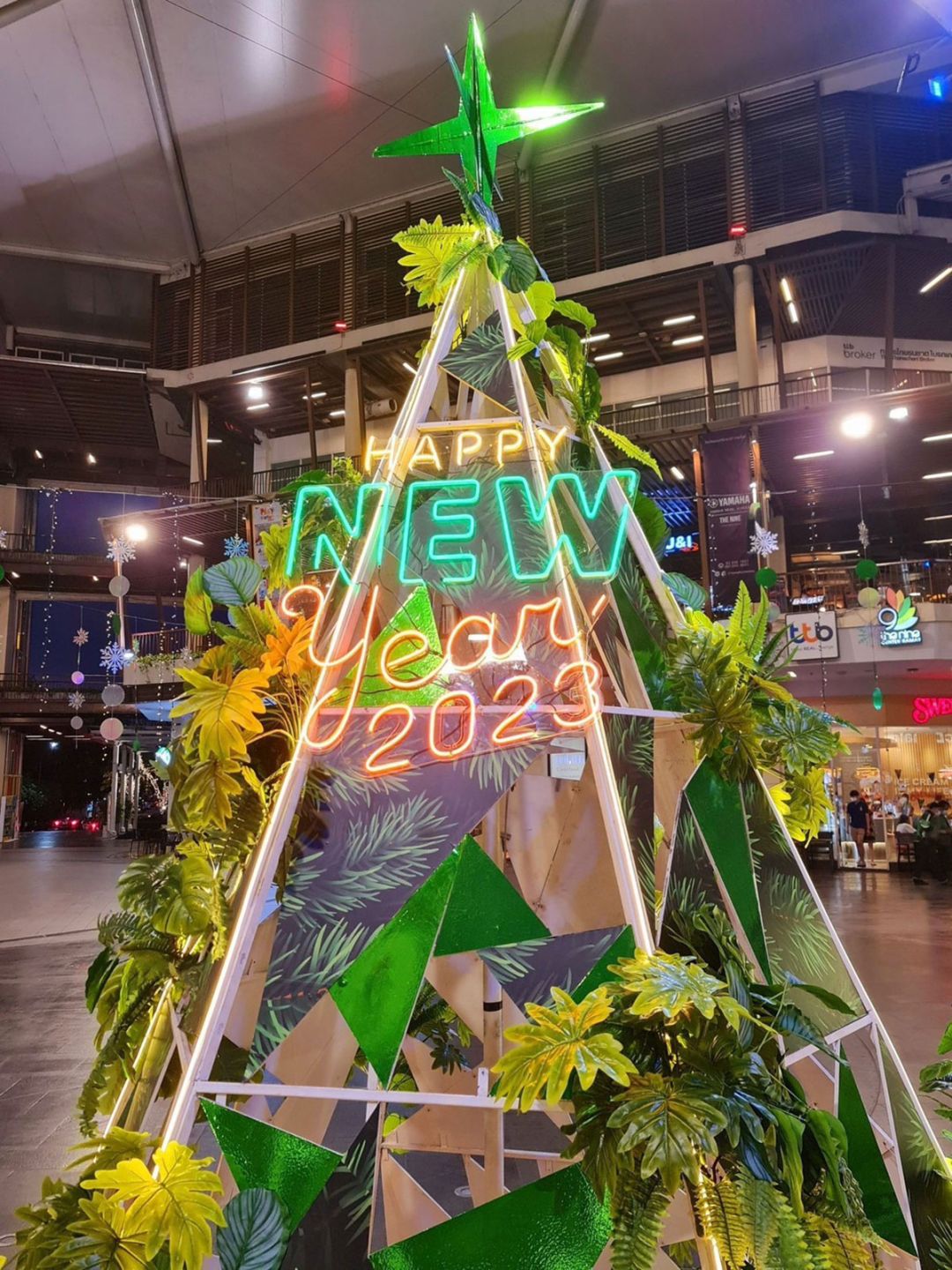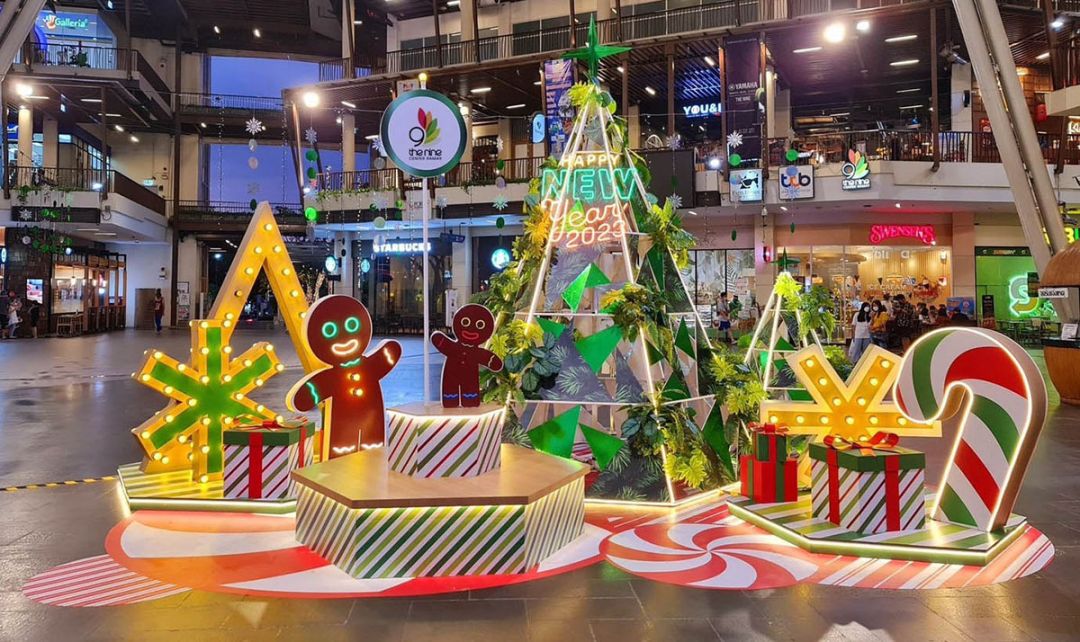 ส่วน เดอะไนน์ เซ็นเตอร์ พระราม 9และ เดอะไนน์ เซ็นเตอร์ ติวานนท์ พบกับต้นคริสต์มาสที่เต็มไปด้วยไอเดียสุดเก๋ มีการนำไม้มาทำเป็นโครงต้นคริสต์มาส พร้อมแซมด้วยต้นไม้เขียวประดับไฟสีนวล ยิ่งชวนน่ามอง ตลอดจนการจัดองค์ประกอบตกแต่งรอบๆที่มีทั้งสโนว์เฟล็ก กล่องของขวัญรายล้อมและ “เจ้าจิงเจอร์เบรด” (Gingerbread) ที่นำความสดใสและรอยยิ้มมารอมอบความสุขและความสนุกให้กับทุกคน