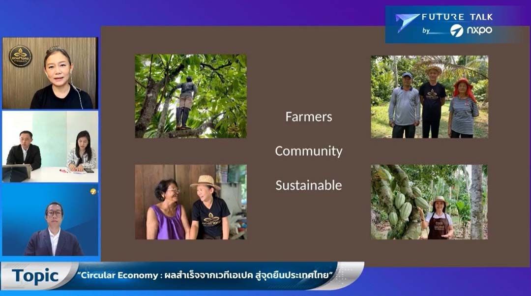 นางจิรายุณัฐ กล่าวว่า การขับเคลื่อนเศรษฐกิจหมุนเวียนจากพื้นที่ มีจุดเริ่มต้นมาจากการเห็นคุณค่าของทรัพยากรในพื้นที่ที่เรามีคือ โกโก้ ซึ่งในชุมชนจังหวัดนครศรีธรรมราช ได้ปลูกกันมายาวนาน โดยปลูกร่วมกับพืชชนิดอื่น เช่น เงาะ มังคุด ทุเรียน กระท้อน รวมถึงพืชสวนครัว ผ่านการปลูกแบบออร์แกนิค อย่างไรก็ตามในช่วงแรกเรายังไม่รู้หลักการแปรรูป หรือทำออกมาเป็นธุรกิจ จึงค่อย ๆ ศึกษาเรียนรู้ โดยยึดแนวคิดเศรษฐกิจพอเพียงของในหลวงรัชกาลที่ 9 เป็นต้นแบบ เน้นการรักษาสิ่งแวดล้อม จนมาถึงการแปรรูปผลิตภัณฑ์ ปรับบรรจุภัณฑ์ ให้เป็นธรรมชาติ และมีความเป็นไทย คงเอกลักษณ์ท้องถิ่น สอดรับกับความมั่นคงทางด้านอาหาร และเป็นครัวของโลกได้ ซึ่งวิธีคิดแบบนี้ควรอยู่ในทุกธุรกิจไม่ว่าจะขนาดเล็กหรือใหญ่ เนื่องจากประเทศไทยมีทรัพยากรธรรมชาติที่หลากหลาย แนวคิดเศรษฐกิจหมุนเวียน จะไม่ใช่แค่เพียงการกำจัดขยะ แต่จะไหลเวียนไปสู่เกษตรกร พัฒนาไปสู่พืชเกษตรชนิดอื่น ๆ เช่น การใช้น้ำตาลมะพร้าวในพื้นที่มาเป็นวัตถุดิบในการผลิต การออกแบบเสื้อผ้าที่ลดการสิ้นเปลืองทรัพยากร ก่อให้เกิดการเรียนรู้ในชุมชน และยังเป็นต้นแบบ เป็นแหล่งเรียนรู้ให้กลุ่มนักศึกษาและนักท่องเที่ยวที่เข้ามาศึกษาได้อีกด้วย