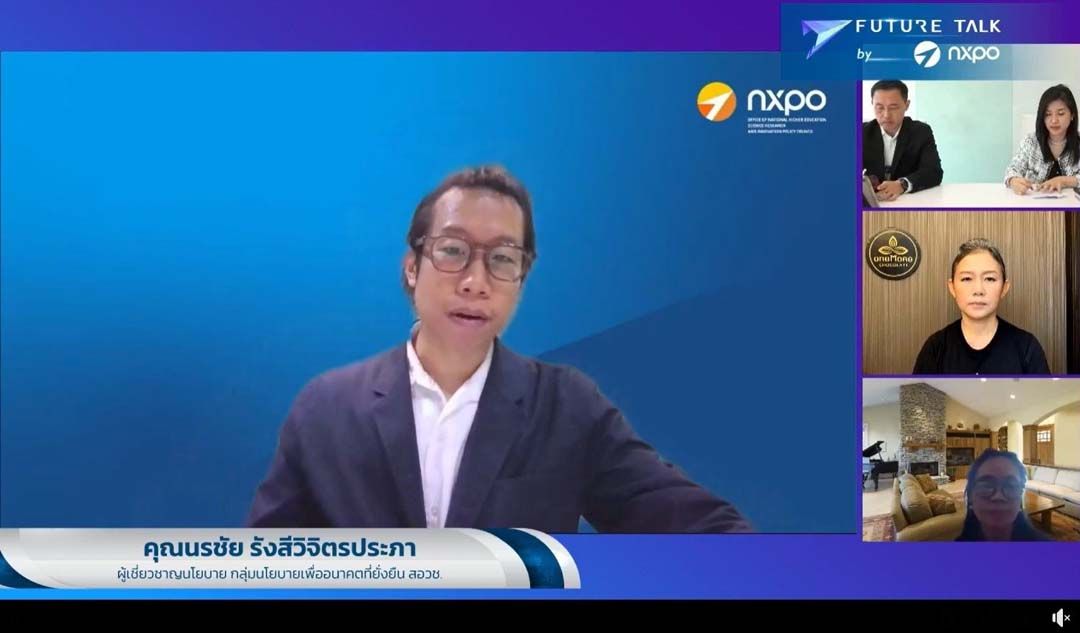 สำนักงานสภานโยบายการอุดมศึกษา วิทยาศาสตร์ วิจัยและนวัตกรรมแห่งชาติ (สอวช.) จัดการเสวนาผ่านรายการ Future Talk by NXPO ในหัวข้อ “Circular Economy : ผลสำเร็จจากเวทีเอเปค สู่จุดยืนประเทศไทย” โดยมีผู้เข้าร่วมเสวนาประกอบด้วย นายเฉลิม โกกนุทาภรณ์ ประธานเจ้าหน้าที่บริหาร บริษัท ไทยอีสเทิร์น กรุ๊ป โฮลดิ้งส์ จำกัด (มหาชน) ดร.สวนิตย์ บุญญาสุวัฒน์ คณะทำงาน BCG Model สภาอุตสาหกรรมแห่งประเทศไทย นางจิรายุณัฐ อัจฉริยะขจร เจ้าของแบรนด์ One more ช็อกโกแลตสัญชาติไทย และ นายนรชัย รังสีวิจิตรประภา ผู้เชี่ยวชาญนโยบาย กลุ่มนโยบายเพื่ออนาคตที่ยั่งยืน สอวช. ดำเนินรายการโดย ดร.ศรวณีย์ สิงห์ทอง ผู้อำนวยการฝ่ายกลุ่มนโยบายเพื่ออนาคตที่ยั่งยืน สอวช.