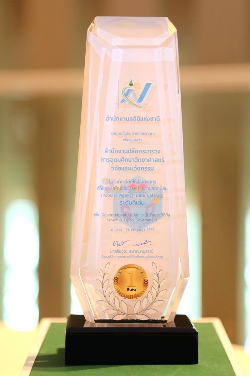 22 ธันวาคม 2565 ศ.ดร.นพ.สิริฤกษ์ ทรงศิวิไล ปลัดกระทรวงการอุดมศึกษา วิทยาศาสตร์ วิจัยและนวัตกรรม (อว.) ได้มอบหมายให้ น.ส.จันทนา วงศ์เยาว์ฟ้า ผอ.กองระบบและบริหารข้อมูลเชิงยุทธศาสตร์การอุดมศึกษา วิทยาศาสตร์ วิจัยและนวัตกรรม สำนักงานปลัดกระทรวง อว. เป็นผู้แทน ขึ้นรับ “รางวัลหน่วยงานที่มีผลงานโดดเด่นด้านระบบบัญชีข้อมูลหน่วยงานยอดนิยม ระดับดีเด่น (Gold Award)” ในการขับเคลื่อนบัญชีข้อมูลภาครัฐ (Government Data Catalog) ประจำปีงบประมาณ พ.ศ. 2565 โดยรางวัลนี้เป็นการประกาศเกียรติคุณและเชิดชูหน่วยงานที่มีความมุ่งมั่นในการจัดทำบัญชีข้อมูลภาครัฐ เพื่อให้ประเทศขับเคลื่อนไปสู่การเป็นรัฐบาลอัจฉริยะ (Smart & Open Government)