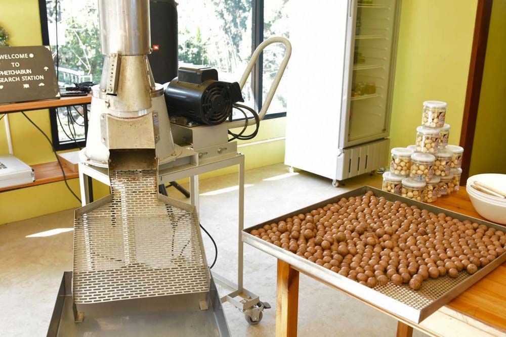 นางสาวริยา ด่อนศรี ทีมนักวิจัย กล่าวว่า วช. ได้มีการนำนวัตกรรมจากโครงการเพิ่มศักยภาพการผลิตและยกระดับรายได้ชุมชนด้วยนวัตกรรมเครื่องสีเปลือกแมคคาเดเมีย ต่อยอดจากโครงการเดิม โครงการพัฒนามาตรฐานการผลิตแมคคาเดเมียอบแห้งสำหรับชุมชน ซึ่งนำไปสู่การเพื่อเพิ่มมูลค่าสำหรับชุมชนในพื้นที่ตั้งของสถานีวิจัยเพชรบูรณ์ 2 แห่ง 1) บ้านเข็กน้อย ตำบลเข็กน้อย อำเภอเขาค้อ และ 2) บ้านทับเบิก ตำบลวังบาล อำเภอหล่มเก่า จังหวัดเพชรบูรณ์ เพื่อเป็นแหล่งเรียนรู้ ด้านเทคโนโลยีการผลิตและแปรรูปแมคคาเดเมียแบบครบวงจรที่มีมาตรฐานเป็นที่ยอมรับสำหรับเกษตรกรในชุมชนและบุคคลที่สนใจได้เข้ามาเรียนรู้รวมถึงการส่งเสริมการแปรรูปผลผลิตแทนการจำหน่ายผลผลิต โดยกระบวนการแปรรูปแมคคาเดเมียเริ่มตั้งแต่การเก็บผลร่วงจากต้น การกะเทาะเปลือก การผึ่ง การอบ การกะเทาะกะลา และการอบก่อนบรรจุลงภาชนะสำหรับจำหน่ายจำเป็นต้องใช้เครื่องมือกะเทาะเมล็ดแมคคาเดเมียที่เหมาะสำหรับกลุ่มเกษตรกร หรือเกษตรกรรายย่อยสำหรับใช้ในการแปรรูป จึงได้คิดค้นเครื่องกะเทาะเมล็ดแมคคาเดเมีย ซึ่งใช้เครื่องบรรจุภัณฑ์เมล็ดแมคคาเดเมียเพื่อยืดอายุของสินค้าและสร้างมูลค่าให้แก่เกษตรกรในกระบวนการการแปรรูปแมคคาเดเมีย ลักษณะการใช้งาน คือ เมื่อนำผลกะลาแมคคาเดเมียใส่เข้าด้านบนของเครื่องกะเทาะ ผลกะลาแมคคาเดเมียจะตกลงไปภายในเครื่องมีแกนหมุนเพื่อให้ผลกะลาที่ตกลงไปกระทบกับชุดใบมีดสำหรับการกะเทาะผลกะลาให้แตก จากนั้นกะลาและเนื้อในที่แยกออกจากกันตกลงสู่ถาดรองรับภายนอกเครื่องกะเทาะและนำไปสู่กระบวนการอื่นต่อไป และเป็นศูนย์กลางในการรับซื้อแมคคาเดเมียจากเกษตรกรในชุมชนมาแปรรูปต่อ โดยการแปรรูปเป็นผลิตภัณฑ์ที่หลากหลายช่วยเพิ่มทางเลือกให้ผู้บริโภคและเพิ่มมูลค่าสินค้า อีกทั้งยังลดปริมาณวัสดุเหลือใช้ทางการเกษตรด้วยการแปรรูปเป็นผลิตภัณฑ์ที่สร้างมูลค่าสร้างรายได้ให้กับเกษตรกรได้อย่างยั่งยืน