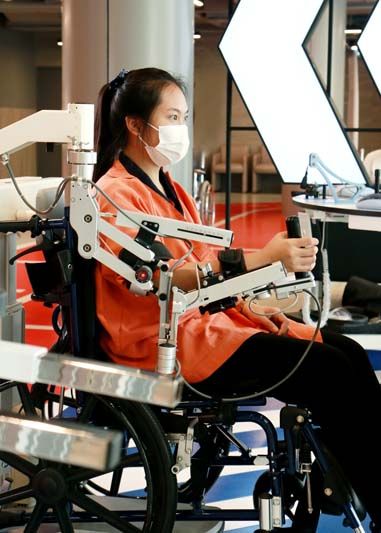 Armeo Spring-หุ่นยนต์กายภาพบำบัดสำหรับผู้ป่วยโรคหลอดเลือดสมองที่มีปัญหาแขนอ่อนแรง เหมาะสำหรับผู้ป่วยที่เริ่มขยับกล้ามเนื้อแขนได้ แต่แรงกล้ามเนื้อและการควบคุมการเคลื่อนไหวยังไม่ดีพอสำหรับการใช้งานในชีวิตประจำวัน โดยหุ่นยนต์นี้ช่วยทำให้การฝึกการควบคุมและออกแรงกล้ามเนื้อทำได้อย่างมีประสิทธิภาพมากขึ้น โดยจะรายงานผลผ่านหน้าจอเพื่อให้ผู้ป่วยได้เรียนรู้และปรับการเคลื่อนไหวในรูปแบบที่ถูกต้อง