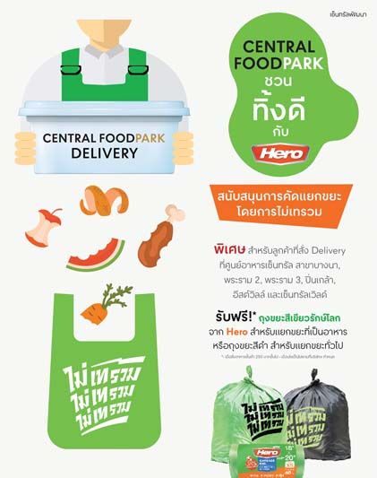 เซ็นทรัลพัฒนา ได้รณรงค์ให้ร้านอาหารในศูนย์การค้า และศูนย์อาหารFOODPARK ทำการคัดแยกขยะอาหารโดยการไม่เทรวม ทั้งนี้ยังได้มีสิทธิพิเศษมอบถุงขยะ สำหรับลูกค้าที่สั่งอาหารDelivery กับทาง FoodPark นอกจากนี้ยังมอบสิทธิพิเศษสำหรับร้านค้าภายในศูนย์การค้าที่สนใจเข้าร่วมโครงการได้ส่วนลดพิเศษในการซื้อถุงขยะ Hero เพื่อแยกขยะตั้งแต่ต้นทาง เพื่อร่วมกันคัดแยกขยะอาหารตั้งแต่ต้นทางด้วยวิธีง่ายๆ เริ่มจากการจัดการคัดแยกเศษอาหารในบ้าน ในร้าน ใส่ถุงขยะคัดแยกชัดเจน เริ่มที่เรา เริ่มที่บ้าน เริ่มในครัว เริ่มที่รถขนขยะ กทม. แล้วต่อยอดขยายผลจนเป็นชีวิตประจำวัน เริ่มกันวันนี้ เพราะโลกร้อนรอไม่ได้ ทิ้งดี เพื่อโลกเพื่อเรา ทั้งนี้ เซ็นทรัลพัฒนา ยกระดับมาตรฐานศูนย์อาหารสู่ระดับสากล โดย foodwOrld เป็นศูนย์อาหารแห่งแรกที่ได้รับการรับรองมาตรฐานด้านอาคารเขียวระดับสากล (LEED) อีกทั้งยังดำเนินการจัดการสิ่งแวดล้อมภายใต้การรับรองมาตรฐาน ISO 14001 ครอบคลุมการจัดการขยะ แยกขยะเปียก ขยะแห้งนำขยะที่แยกไปรีไซเคิลเป็นเชื้อเพลิงและหมักเป็นก๊าซชีวภาพและปุ๋ย ทำการบันทึกข้อมูลขยะขนออกเพื่อติดตามปริมาณการลดขยะฝังกลบอย่างจริงจัง ตามแผนงาน The Journey to Net Zero สู่การเป็นองค์กรปลดปล่อยคาร์บอนสุทธิเป็นศูนย์ภายในปี ค.ศ. 2050