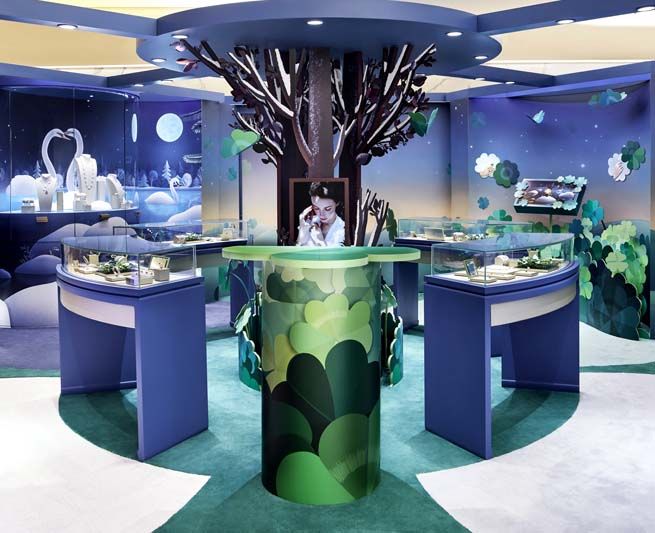 บูติกป๊อป-อัพของเมซงได้รับการออกแบบตกแต่งโดยอาศัยแรงบันดาลใจจากรูปทรงใบโคลเวอร์สี่แฉกผ่านการแบ่งส่วนในการจัดแสดงเครื่องประดับถึงสี่บรรยากาศ อันได้แก่สวนโคลเวอร์ (a clover garden), จิ้งจอกกลางหิมะ (a fox in a snowy landscape), นกน้อยในป่าฤดูหนาว (a bird in a winter forest) และหงส์ขาวกลางทะเลสาบรัตติกาล (a lakeside with swans lingering at night) ซึ่งแต่ละบริเวณล้วนเต็มไปด้วยความวิจิตรบรรจงเยี่ยงฉันทลักษณ์แห่งกวีนิพนธ์ต่างเวทีแสดงความงดงามหลากอารมณ์ให้แก่เครื่องประดับ Alhambra โมทิฟเจ้าของรูปทรงแบบฉบับอันโดดเด่นเหนือกระแสความนิยมของยุคสมัย เผยลูกเล่นแห่งเทคนิคงานฝีมือทางการสรรค์สร้างสไตล์ต่างๆ อยู่บนภูมิทัศน์จำลองความงดงาม สดใสในธรรมชาติ อันสะท้อนถึงมุมมองสดใสที่มีต่อชีวิตของเมซง