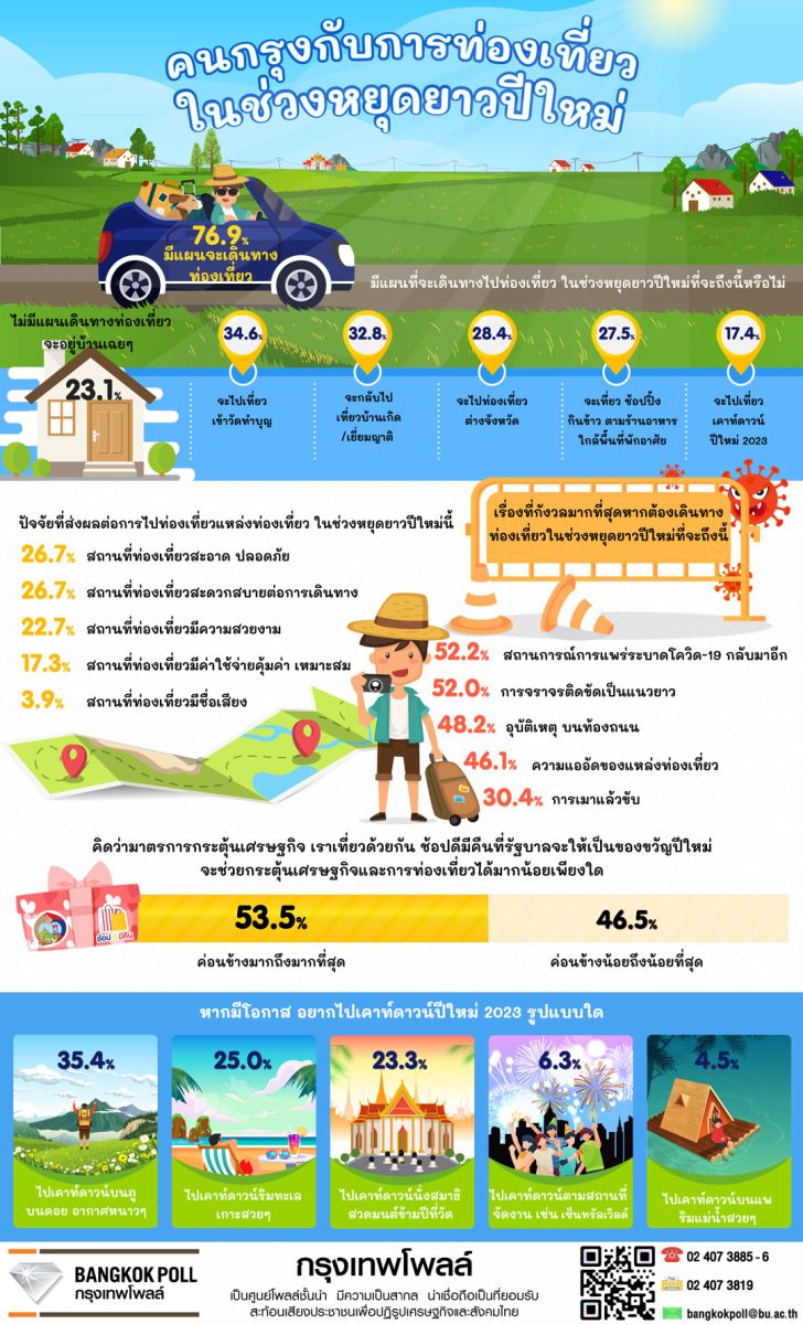 30 ธันวาคม 2565 “กรุงเทพโพลล์” โดยมหาวิทยาลัยกรุงเทพ เปิดเผยผลสำรวจความคิดเห็นของประชาชน เรื่อง “คนกรุงกับการท่องเที่ยวในช่วงหยุดยาวปีใหม่” โดยเก็บข้อมูลจากกลุ่มตัวอย่างจำนวน 1,203 คน พบว่า คนกรุงส่วนใหญ่ร้อยละ 76.9 มีแผนจะเดินทางท่องเที่ยว โดยในจำนวนนี้ร้อยละ 34.6 จะไปเที่ยวเข้าวัดทำบุญ รองลงมาร้อยละ 32.8 จะกลับไปเที่ยวบ้านเกิด / เยี่ยมญาติ และร้อยละ 28.4 จะไปท่องเที่ยวต่างจังหวัด ขณะที่ร้อยละ 23.1 ไม่มีแผนจะเดินทางท่องเที่ยว จะอยู่บ้านเฉยๆ / ติดทำงาน