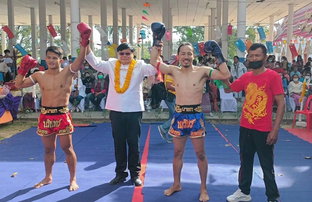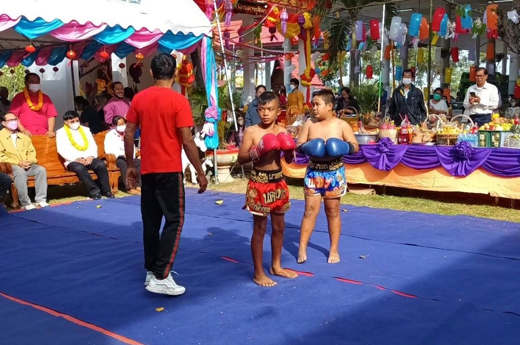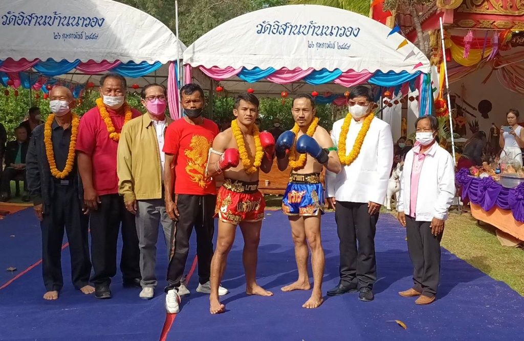 นอกจากนี้ในพิธีบวงสรวงดังกล่าวได้มีคู่มวยหลายคู่ทั้งหญิงและชาย ซึ่งล้วนเป็นลูกหลานคนในหมู่บ้าน ได้แสดงศิลปะมวยไทยรำถวาย เช่น เช่น ขุนศึก ม.ราชภัฏจอมบึง, พลังเอ็ม ส.สุชาติ ซึ่งเชื่อกันว่าหลวงปู่แพ่งท่านเป็นคนชอบมวยไทย ทำให้บรรยากาศการประกอบพิธีบวงสรวงเป็นไปอย่างครึกครื้น จากนั้นก็ได้ร่วมกันปล่อยปลาลงในหนองน้ำข้างวัด และนำอาหารที่เหลือจากการเซ่นบวงสรวงนำกลับไปรับประทานเพื่อความเป็นสิริมงคลต่อไป – 003