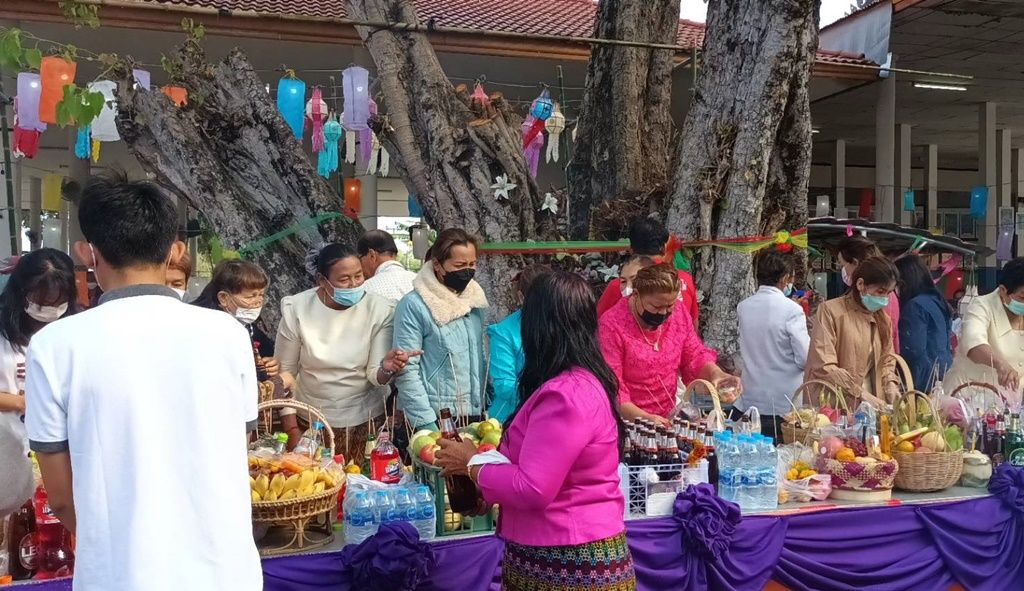 วันที่ 1 ม.ค.65 เมื่อเวลา 09.00 น.ที่บริเวณศาลหลวงปู่แพ่ง วัดเลียบบ้านไผ่ ต.ไผ่ อ.รัตนบุรี จ.สุรินทร์ นายนครินทร์ กองทุน นายกองค์การบริหารส่วนตำบล (อบต.) ไผ่ พร้อมด้วยหัวหน้าส่วนราชการในตำบลไผ่ กำนันผู้ใหญ่บ้าน และประชาชนนับพันคนได้นำอาหารหวานคาวมาร่วมประกอบพิธีบวงสรวงหน้าศาลหลวงปูแพ่ง ซึ่งเป็นศาลเจ้าของหลวงปู่แพ่งตั้งอยู่ภายในบริเวณวัดเลียบบ้านไผ่