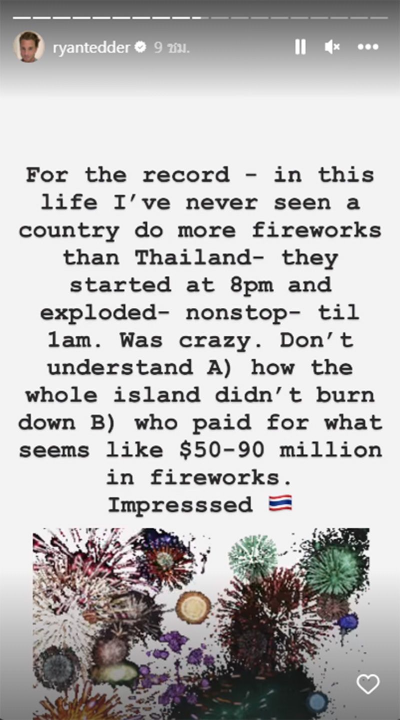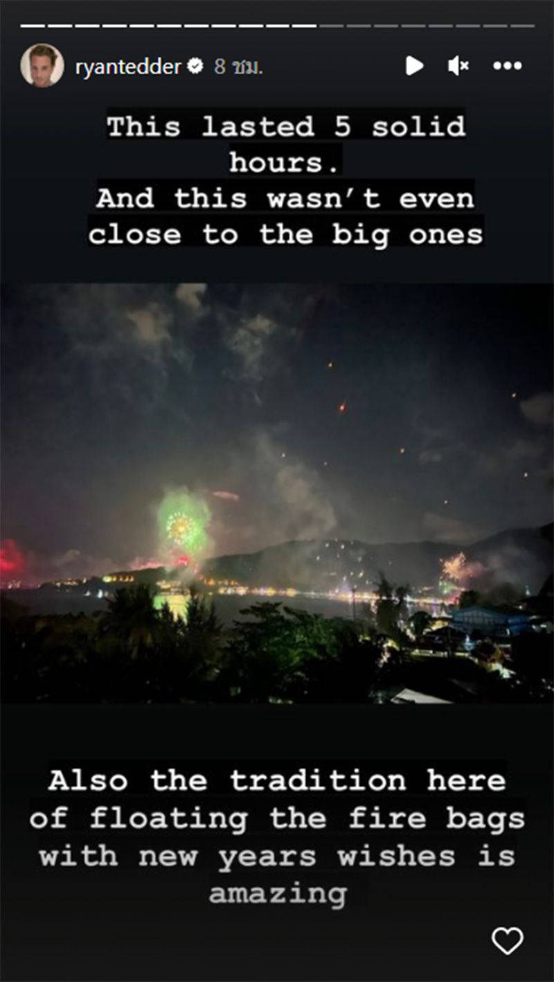 โดยเมื่อค่ำวานนี้ 31 ธันวาคม 2565 ‘ไรอัน เทดเดอร์’ ได้เคานท์ดาวน์ปีใหม่ถ่ายรูปพลุลงสตอรี่ พร้อมเขียนข้อความสุดประทับใจเมืองไทย จุดพลุแบบมาราธอน 5 ชั่วโมง ตั้งแต่เวลา 20.00 น. ของวันที่ 31 ธันวาคม 2565 จนถึงเวลา 01.00 น. ของวันที่ 1 มกราคม 2566 โดยเจ้าตัวได้เขียนข้อความว่า