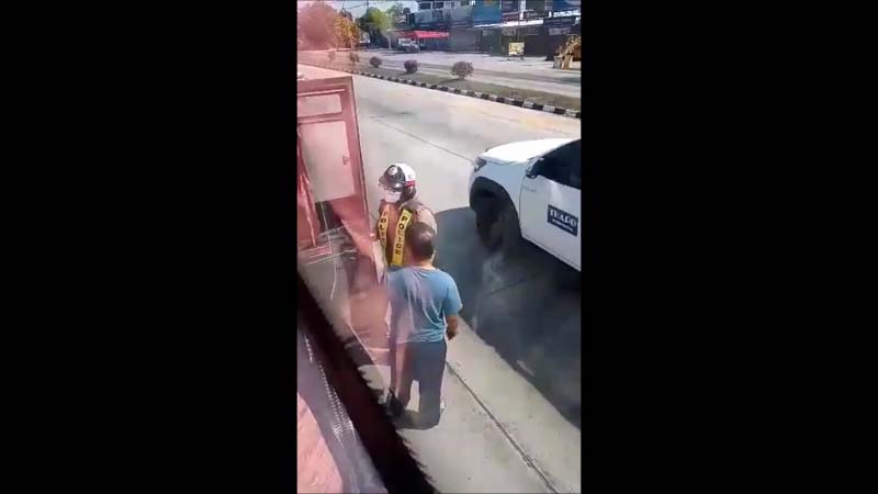 โดยคนขับพูดลิ้นเร็วไปหน่อย จับใจความได้ว่า ให้รีบภรรยาไปเสียค่าปรับ และโวยวายกับเจ้าหน้าที่ตำรวจจราจรว่า เป็นฮ่ายกะด้อกะเนี่ย แลนรถมาหลายสิบปีแล้ว ไม่ได้ทำอะไรซะหน่อย เจ้าเป็นตำรวจได้อย่างไรหัวหน้า ตำรวจก็ถามคนขับมีอาการคึกคักแบบนี้ห่วงเรื่องความปลอดภัยผู้โดยสารและบอกว่าผมทำตามกฎหมายตามนายสั่งช่วง 7 วันอันตราย โต้เถียงกันสักพักตำรวจจราจรก็ถอดเสื้อกั๊กสะท้อนแสงเดินไปหลังรถ โดยคนขับรถโดยสาธารณะและภรรยาก็เดินตามไป ในคลิปก็จบแค่นั้น