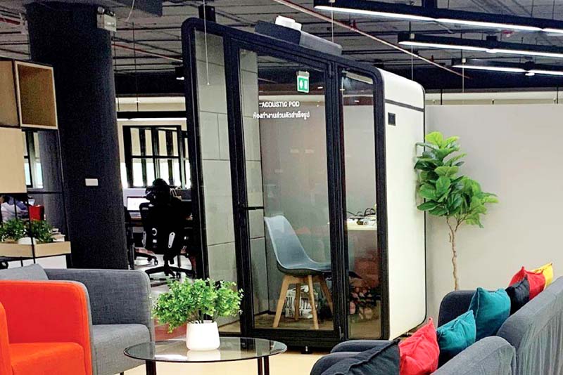 ด้วยประสิทธิภาพที่ช่วยลดเสียงรบกวนได้ถึง 30 เดซิเบล และลดเสียงก้อง เสียงสะท้อนของห้องได้มีการออกแบบให้เหมาะกับการทำงานแบบส่วนตัว ด้วยดีไซน์โมเดิร์น มีระบบหมุนเวียนอากาศภายใน และสามารถลดเชื้อโรคและฝุ่นในอากาศ ด้วย SCG Bi-ion พร้อมอุปกรณ์ครบครัน ติดตั้งแบบ Knock Down เคลื่อนย้ายได้สะดวกจึงเหมาะเป็นห้องประชุมส่วนตัวบนโลกออนไลน์ และที่พลาดไม่ได้คือ จุดพักผ่อนหย่อนใจ ให้ยืดเส้นยืดสายกับมุมสันทนาการเล็กๆ อย่าง โต๊ะปิงปอง หรือมุมจิบกาแฟชิลชิล ชมเมือง ให้ความตึงเครียดจากการทำงานได้ผ่อนคลายบ้าง ก็ไม่น่าสนใจไม่น้อยเลยทีเดียว