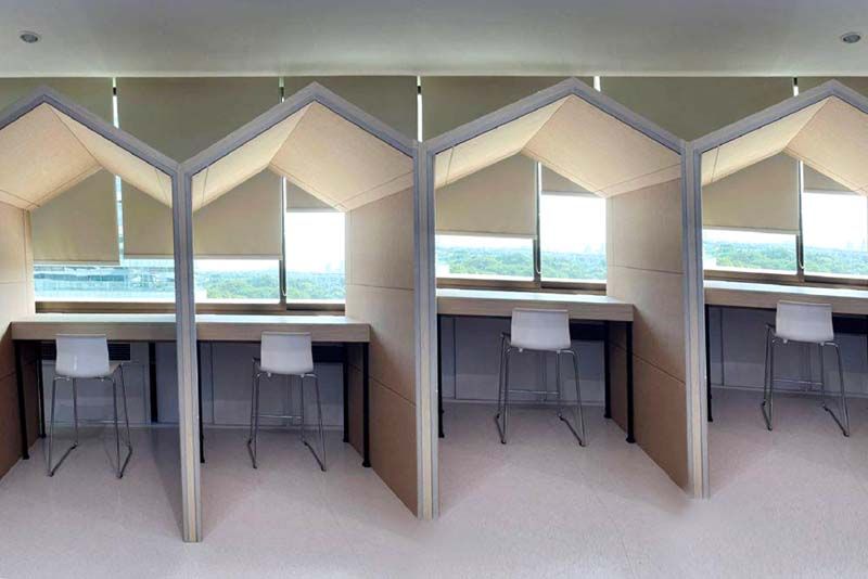 นอกจากนี้ การสร้างพื้นที่ทำงานส่วนตัวให้ตอบโจทย์ไลฟ์สไตล์การทำงานที่ผ่อนคลายให้เหมือนการทำงานที่บ้านจึงเป็นไฮไลท์ของการปรับปรุงพื้นที่ในส่วนนี้ก็คือการทำให้พื้นที่ eye viewที่เคยเป็นพื้นที่เฉพาะ หรือห้องทำงานส่วนตัวมาเปิดเป็นพื้นที่ ให้เข้าถึงได้มากขึ้น พร้อมสร้างความเป็นอิสระ หรือความเป็นส่วนตัวที่ตอบรับวิถีการทำงานใหม่ ทั้งในแบบการกั้น Partition ด้วย วัสดุอะคูสติกสำหรับผนังดูดซับเสียง รุ่น CylenceZandera เพื่อความเป็นส่วนตัวในพื้นที่จำกัด โดยกั้นกำแพงด้านข้าง และเปิดพื้นที่ว่างทั้งด้านหน้าและหลัง โดยด้านหนึ่งเปิดให้เห็นวิวภายนอก ด้านในดีไซน์ให้มีโต๊ะทำงานขนาดกะทัดรัด ออกแบบเพื่อการทำงานทั้งแบบออนไลน์ หรือประชุมเป็น Small Group รวมถึงการนำ AcousticPod มาเสริมสร้างพื้นที่การทำงานส่วนตัว