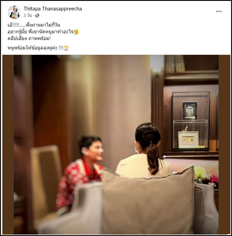 ย้อนกลับไปเมื่อวันเสาร์ที่ 31 ธันวาคม 2565 เฟซบุ๊กชื่อว่า Thitapa Thanasappreecha ของ CEO วี หงษ์ทอง หรือ ฐิตาภา ธนทรัพย์ปรีชา ได้โพสต์ภาพคล้ายแอบถ่ายระหว่าง วี กับ นอท กำลังนั่งคุยกันที่ร้านอาหารแห่งหนึ่ง พร้อมระบุแคปชั่นว่า ” เอ๊!!!!!……พึ่งผ่านมาไม่กี่วัน อยากรู้มั้ย พี่เขานัดหนูมาทำอะไร คลิปเสียง ภาพพร้อม! หนูพร้อมให้ข้อมูลลุงตู่ค่ะ !!! ”