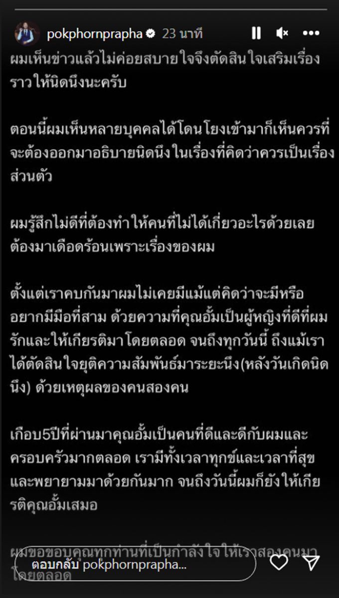 ล่าสุด พก ประธานวงศ์ โพสต์ข้อความผ่านไอจีสตอรี่ ชี้แจงถึงความสัมพันธ์ครั้งนี้ว่า ยุติลงแล้ว
