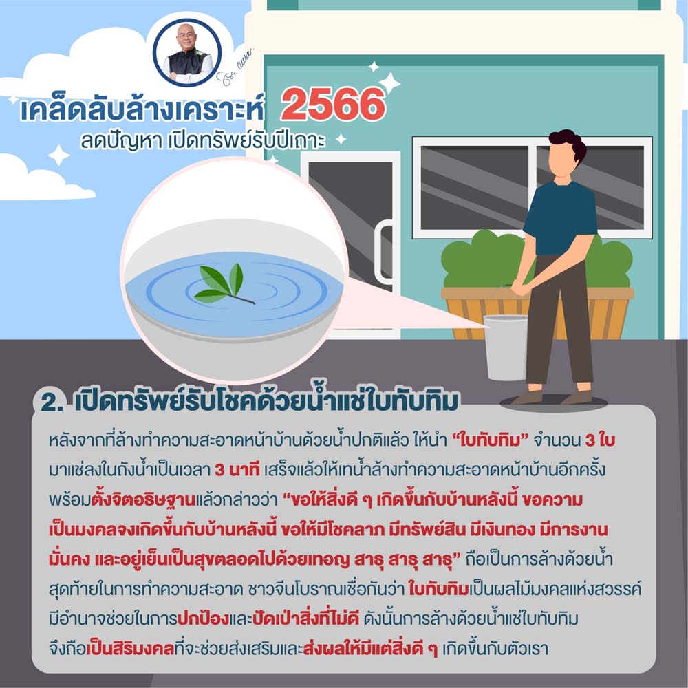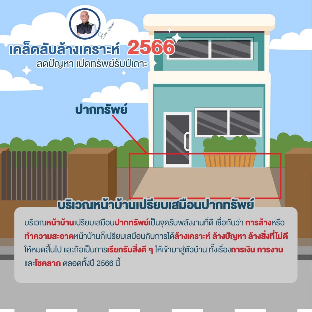 บริเวณหน้าบ้านเปรียบเสมือนปากทรัพย์ เป็นจุดรับพลังงานที่ดี เชื่อกันว่า การล้างหรือทำความสะอาดหน้าบ้านก็เปรียบเสมือนกับการได้ล้างเคราะห์ล้างปัญหาล้างสิ่งที่ไม่ดีให้หมดสิ้นไป และถือเป็นการเรียกรับสิ่งดี ๆ ให้เข้ามาสู่ตัวบ้านทั้งเรื่องการเงิน การงาน และโชคลาภ ตลอดทั้งปี 2566 นี้ มาดูวิธีง่ายๆในการเปิดทรัพย์รับปีเถาะจากซินแสเป็นหนึ่ง ทริคง่ายนิดเดียว