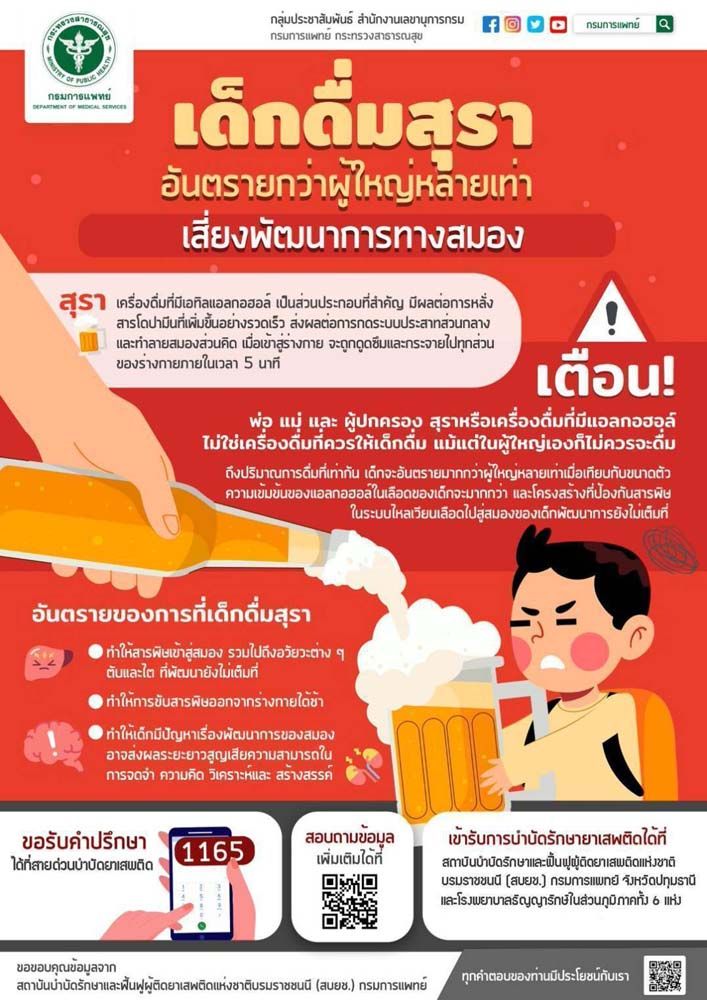 ซึ่งจะทำให้เด็กมีภาวะโภชนาการที่ดี ส่งผลต่อการเจริญเติบโต พัฒนาการ และการพัฒนาสติปัญญา ทั้งนี้ หากประสบปัญหาเกี่ยวกับสุรา หรือยาและสารเสพติดสามารถขอรับคำปรึกษาเรื่องยาและสารเสพติดได้ที่ สายด่วนบำบัดยาเสพติด 1165 สอบถามข้อมูลเพิ่มเติมได้ที่ www.pmnidat.go.th หรือเข้ารับการบำบัดรักษายาเสพติดได้ที่ สถาบันบำบัดรักษาและฟื้นฟูผู้ติดยาเสพติดแห่งชาติบรมราชชนนี (สบยช.) กรมการแพทย์ จังหวัดปทุมธานี และโรงพยาบาลธัญญารักษ์ในส่วนภูมิภาคทั้ง 6 แห่ง ได้แก่ โรงพยาบาลธัญญารักษ์เชียงใหม่ โรงพยาบาลธัญญารักษ์แม่ฮ่องสอน โรงพยาบาลธัญญารักษ์ขอนแก่น โรงพยาบาลธัญญารักษ์อุดรธานี โรงพยาบาลธัญญารักษ์สงขลา และโรงพยาบาลธัญญารักษ์ปัตตานี