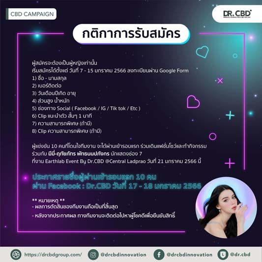 ผู้แข่งขัน 10 คนที่โดนใจทีมงาน จะได้ผ่านเข้ารอบแรก ร่วมเดินแฟชั่นโชว์และทำกิจกรรมร่วมกับ มีมี่-ฤทัยภัทร พัทธนนปภังกร นักแสดงช่อง 7 และ รับของขวัญมูลค่ากว่า 2,500 บาทจาก Dr.CBDที่งาน EarthlabEvent By Dr.CBDณ Central Ladpraoวันที่ 21 มกราคม 2566 นี้ ประกาศรายชื่อผู้ผ่านเข้ารอบแรก 10 คน ผ่าน Facebook : Dr.CBDวันที่ 17 – 18 มกราคม 2566